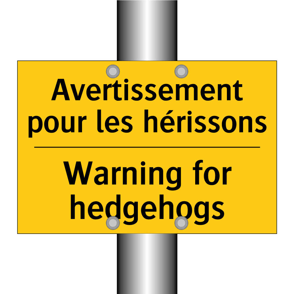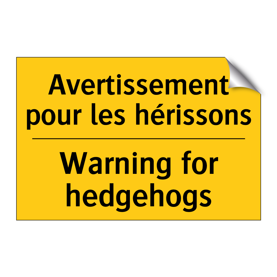 Panneau d'avertissement bilingue avec texte en français : "Avertissement pour les hérissons", et en anglais : "Warning for hedgehogs"