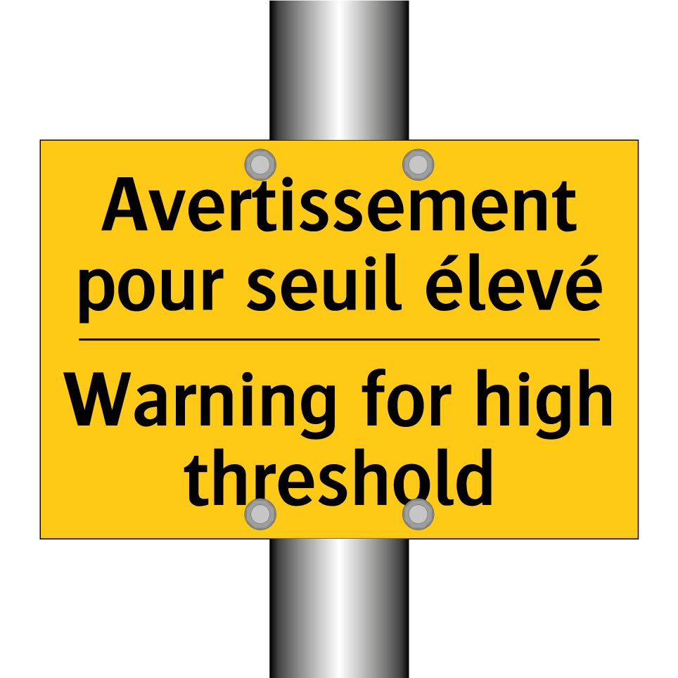 Panneau d'avertissement bilingue avec texte en français : "Avertissement pour seuil élevé", et en anglais : "Warning for high threshold"