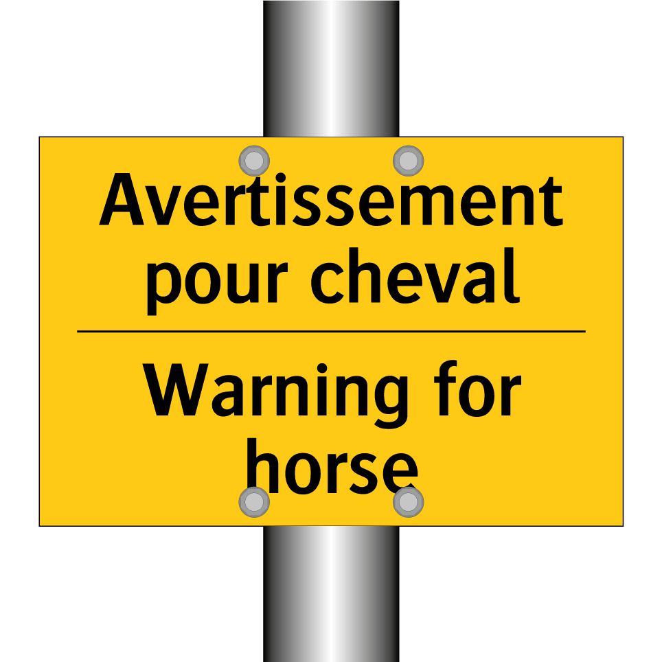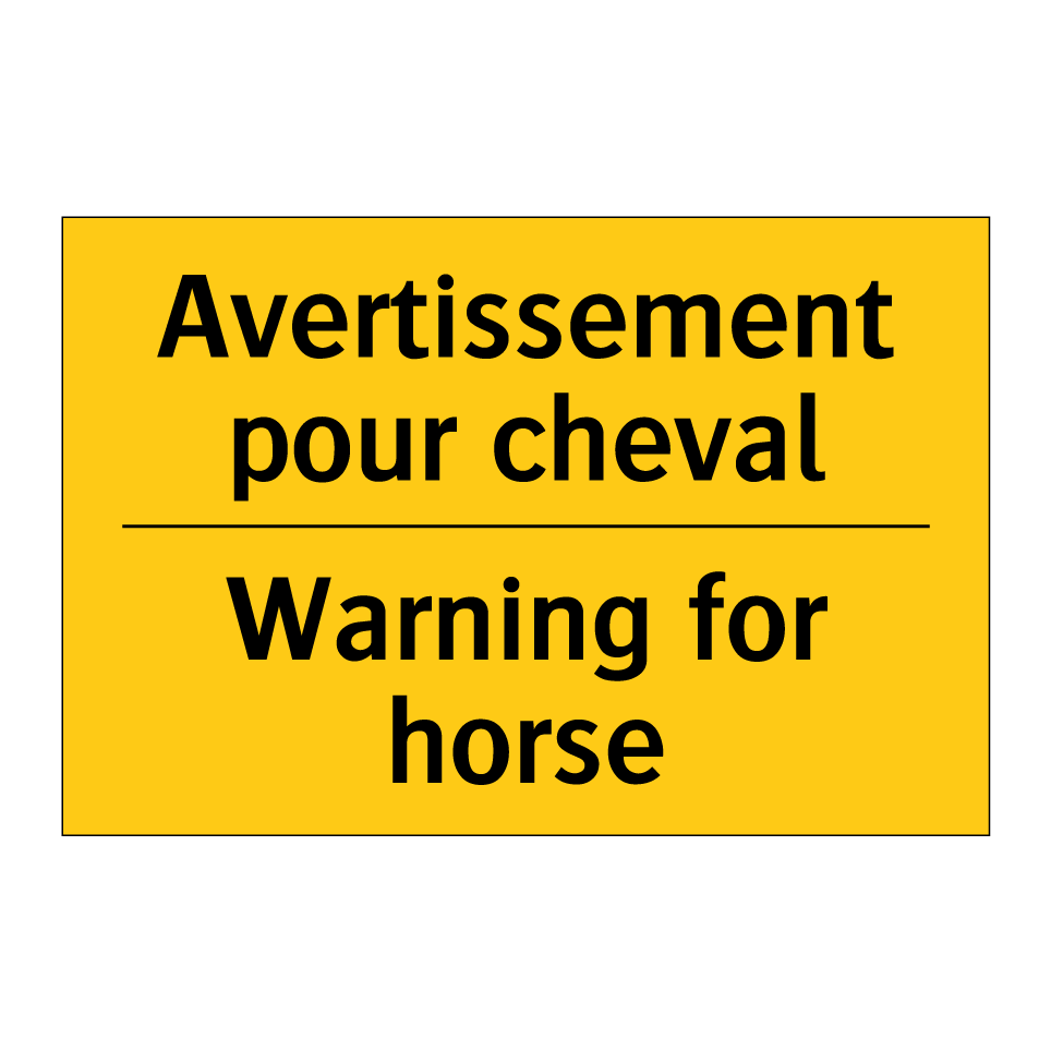 Panneau d'avertissement bilingue avec texte en français : "Avertissement pour cheval", et en anglais : "Warning for horse"