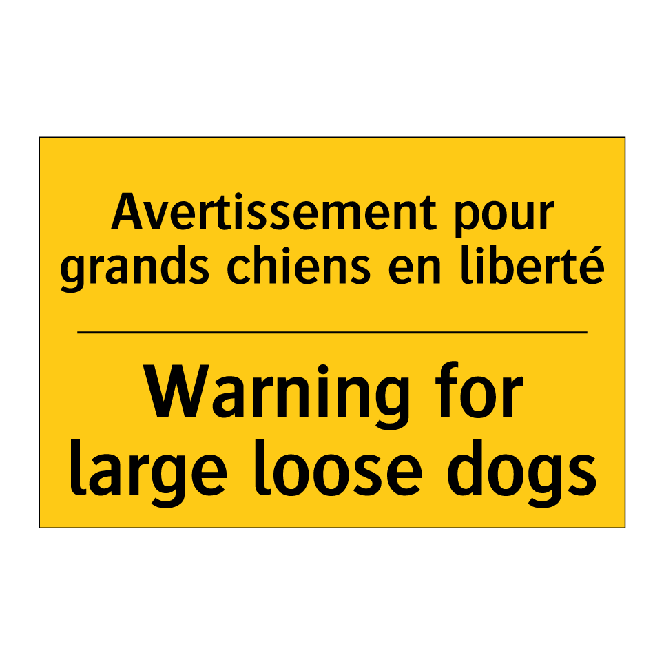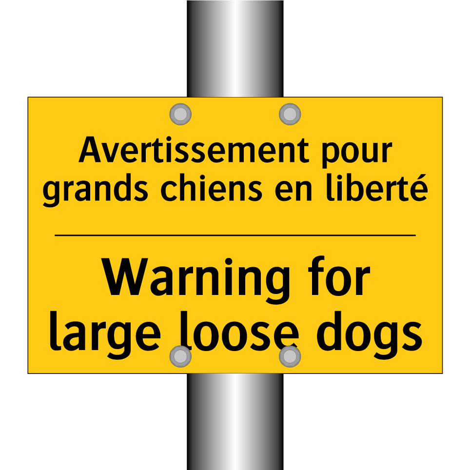 Panneau d'avertissement bilingue avec texte en français : "Avertissement pour grands chiens en liberté", et en anglais : "Warning for large loose dogs"