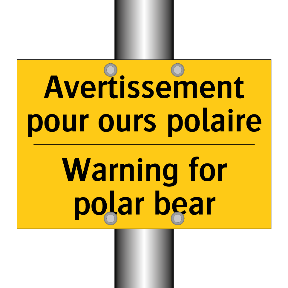 Panneau d'avertissement bilingue avec texte en français : "Avertissement pour ours polaire", et en anglais : "Warning for polar bear"