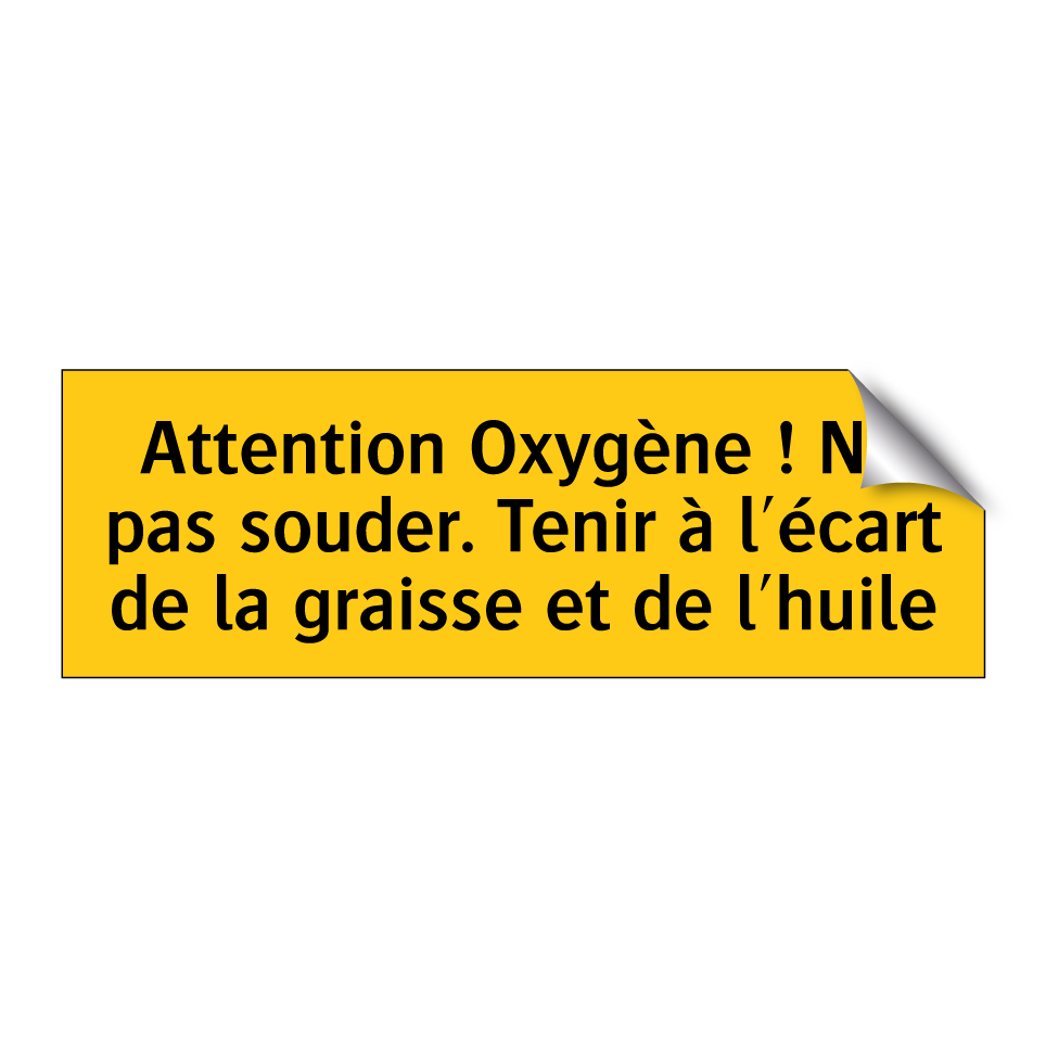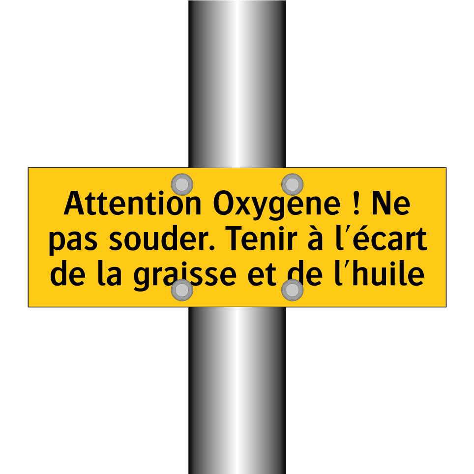 Panneau d'avertissement avec le texte : "Attention Oxygène ! Ne pas souder. Tenir à l'écart de la graisse et de l'huile"