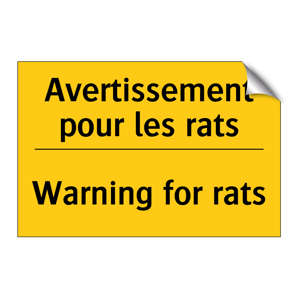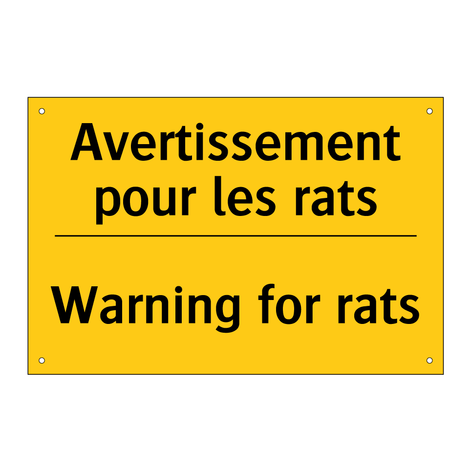Panneau d'avertissement bilingue avec texte en français : "Avertissement pour les rats", et en anglais : "Warning for rats"