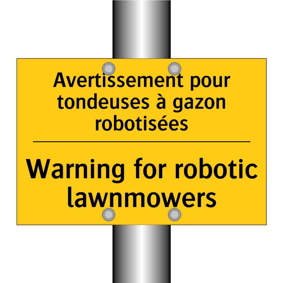 Panneau d'avertissement bilingue avec texte en français : "Avertissement pour tondeuses à gazon robotisées", et en anglais : "Warning for robotic lawnmowers"