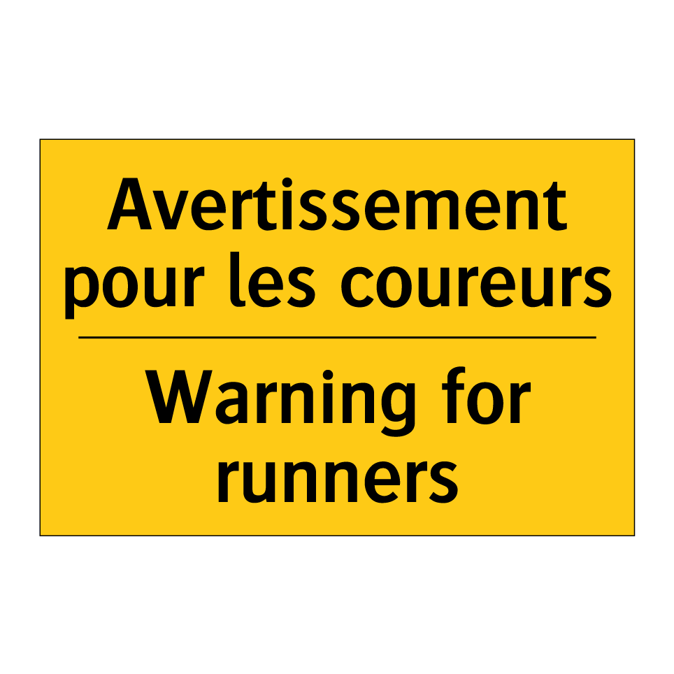 Panneau d'avertissement bilingue avec texte en français : "Avertissement pour les coureurs", et en anglais : "Warning for runners"