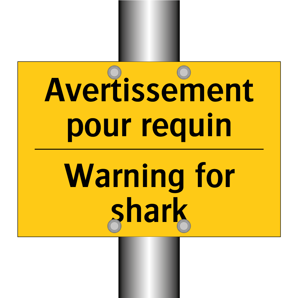 Panneau d'avertissement bilingue avec texte en français : "Avertissement pour requin", et en anglais : "Warning for shark"