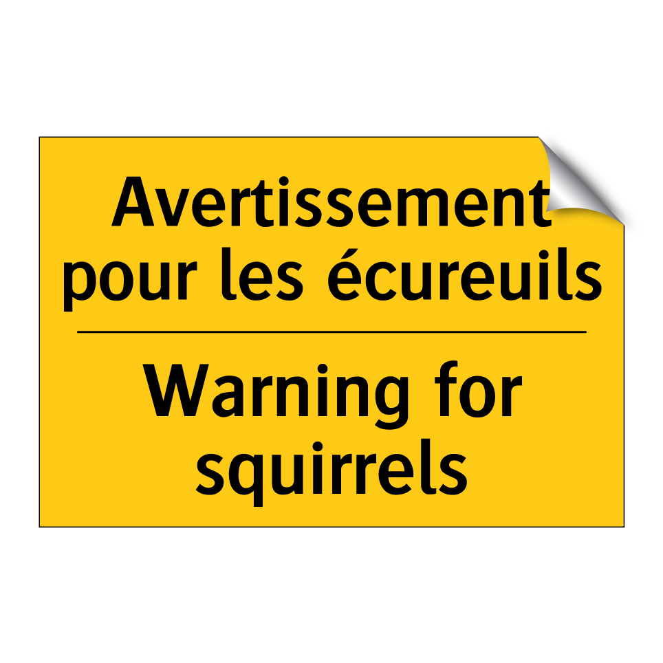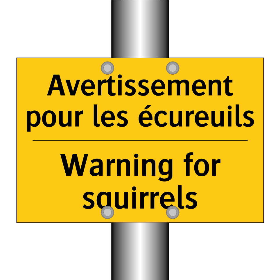Panneau d'avertissement bilingue avec texte en français : "Avertissement pour les écureuils", et en anglais : "Warning for squirrels"