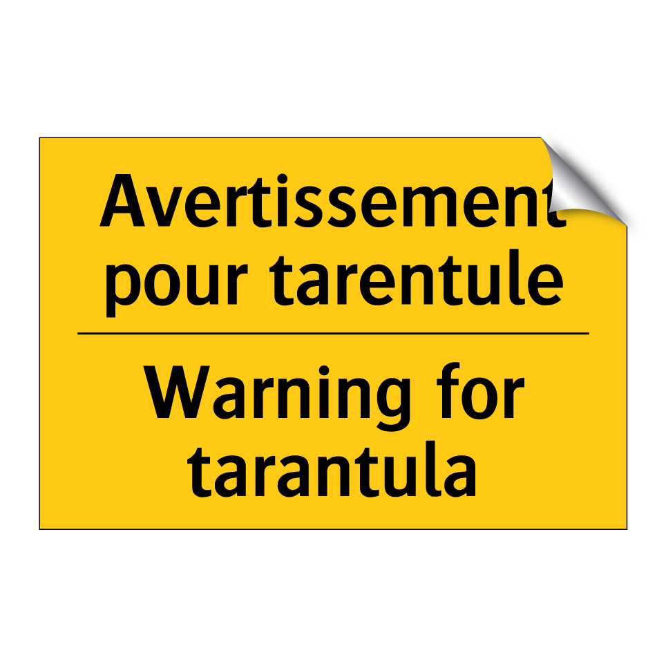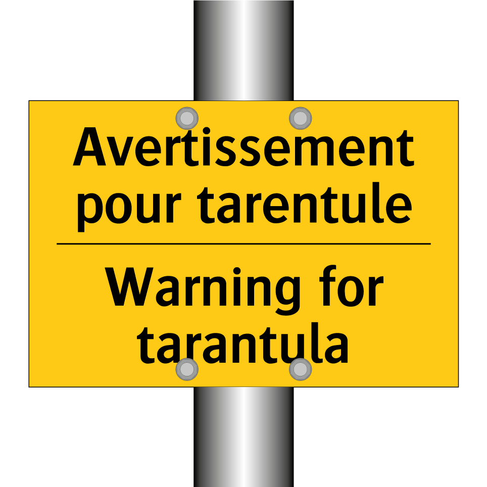 Panneau d'avertissement bilingue avec texte en français : "Avertissement pour tarentule", et en anglais : "Warning for tarantula"