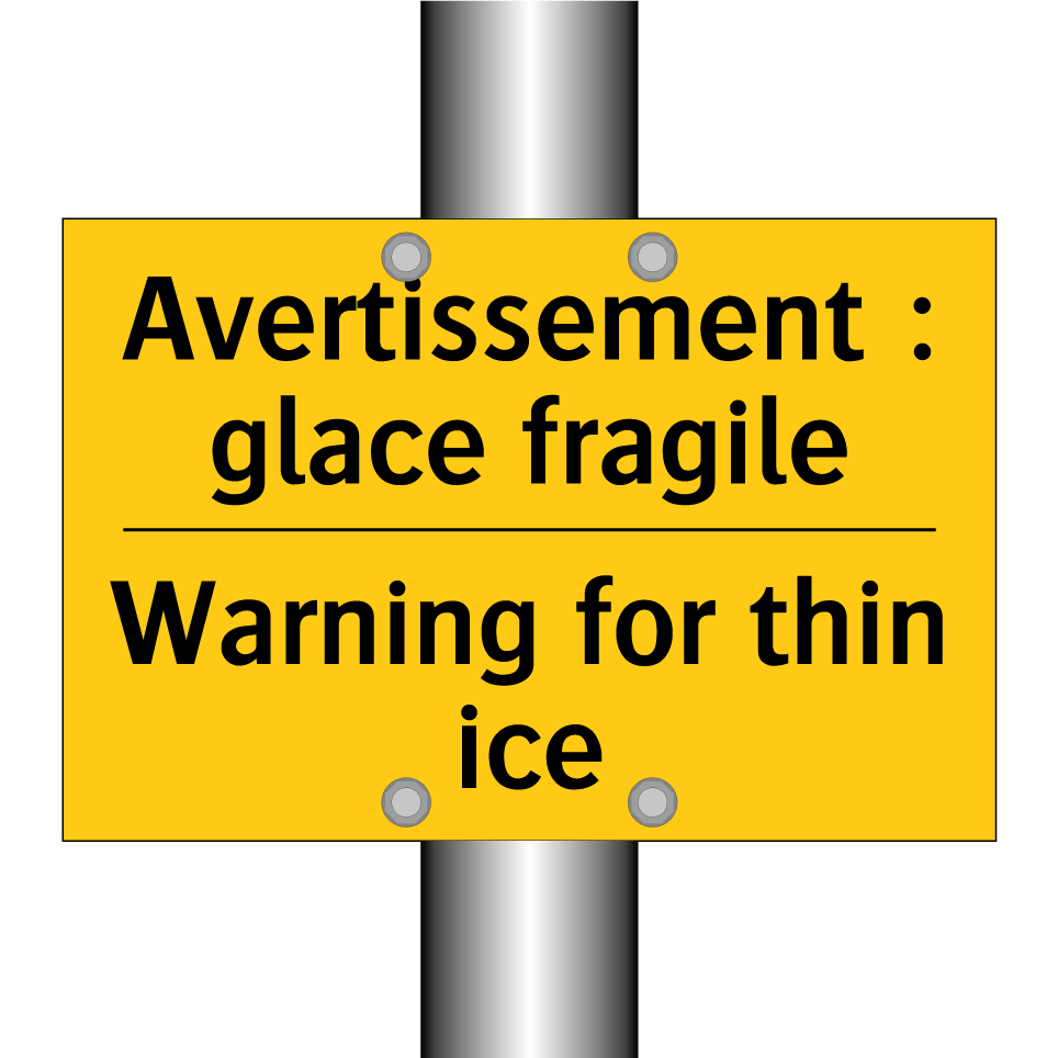 Panneau d'avertissement bilingue avec texte en français : "Avertissement : glace fragile", et en anglais : "Warning for thin ice"