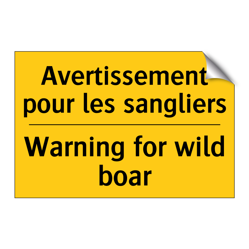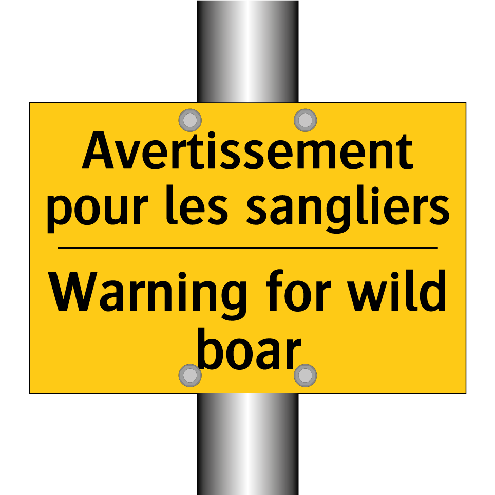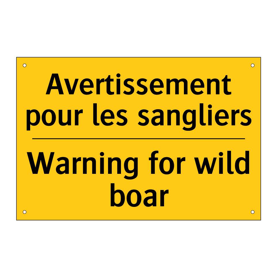 Panneau d'avertissement bilingue avec texte en français : "Avertissement pour les sangliers", et en anglais : "Warning for wild boar"