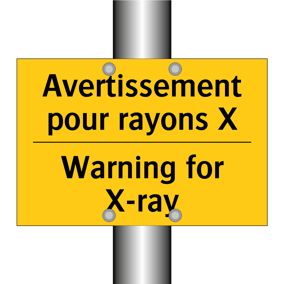 Panneau d'avertissement bilingue avec texte en français : "Avertissement pour rayons X", et en anglais : "Warning for X-ray"