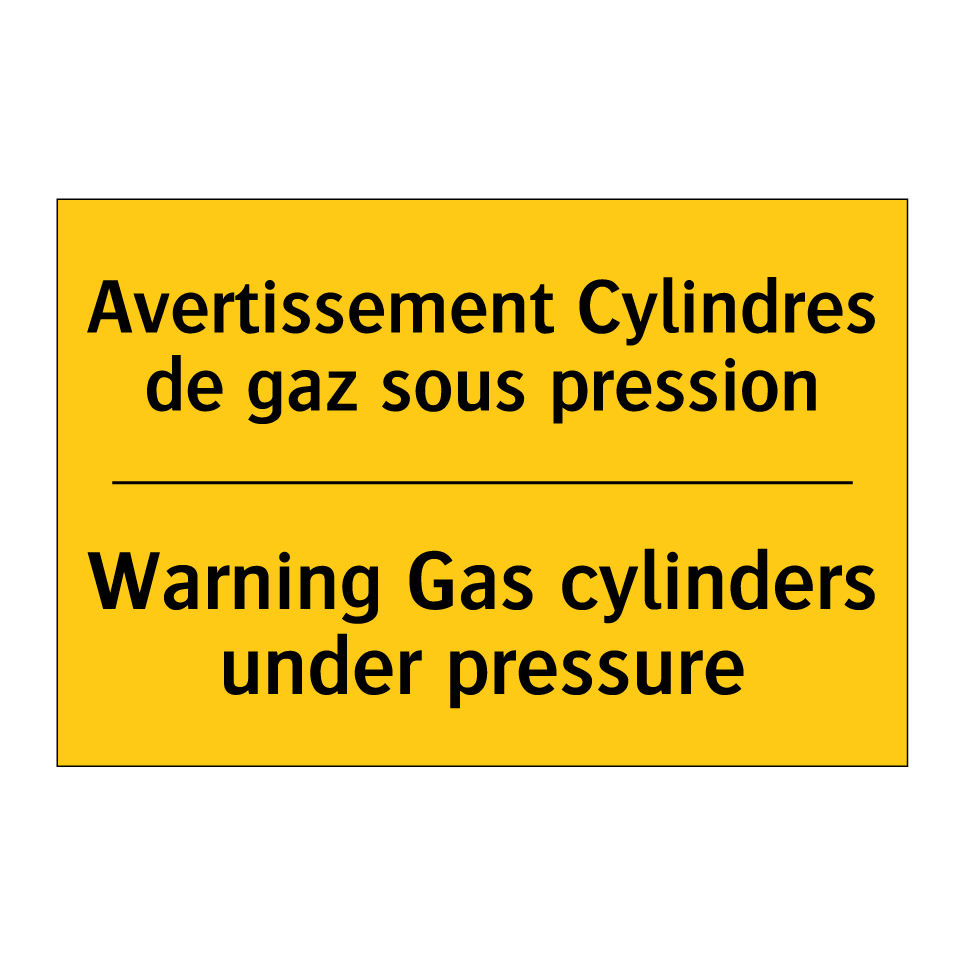 Panneau d'avertissement bilingue avec texte en français : "Avertissement Cylindres de gaz sous pression", et en anglais : "Warning Gas cylinders under pressure"