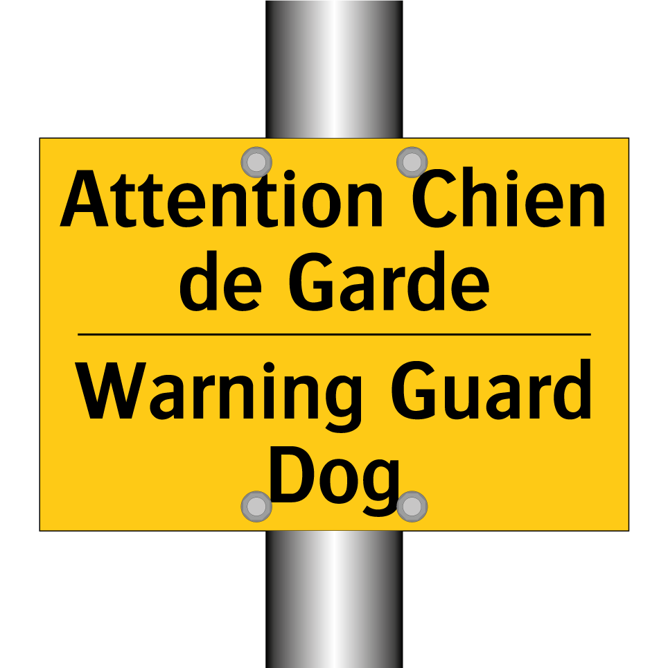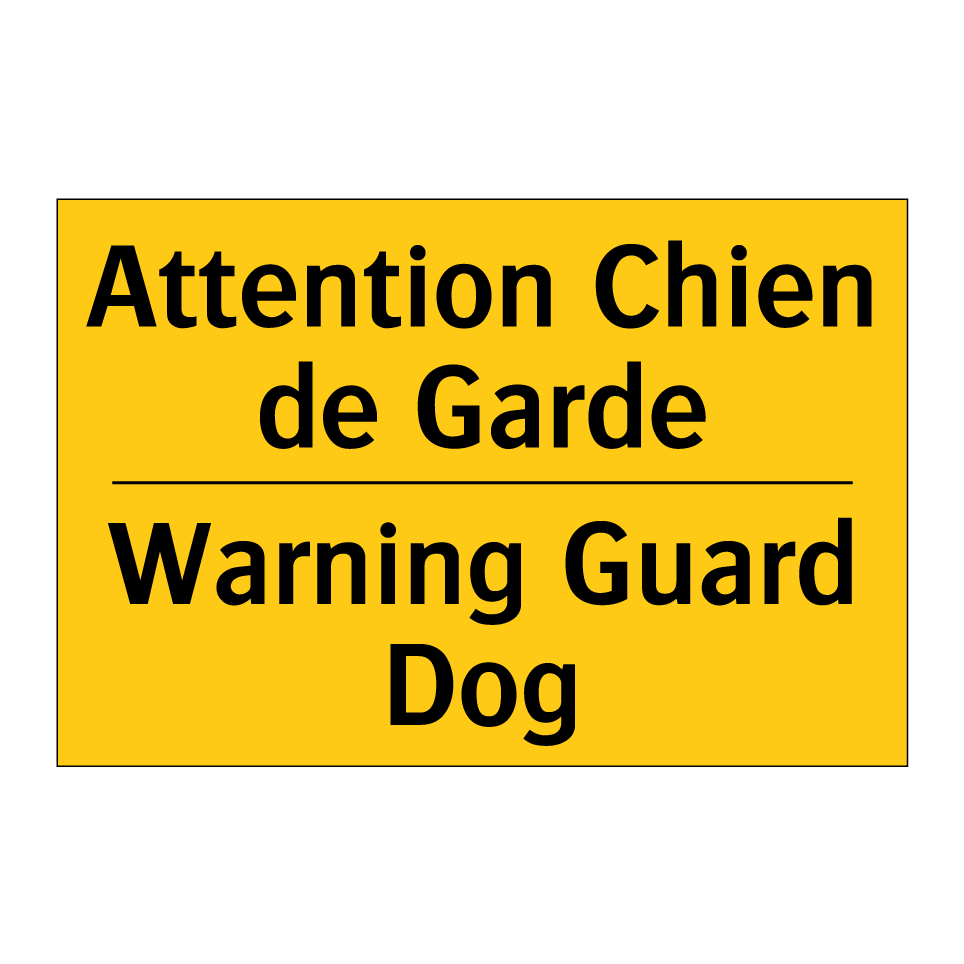 Panneau d'avertissement bilingue avec texte en français : "Attention Chien de Garde", et en anglais : "Warning Guard Dog"