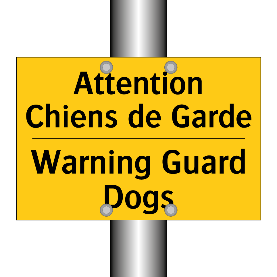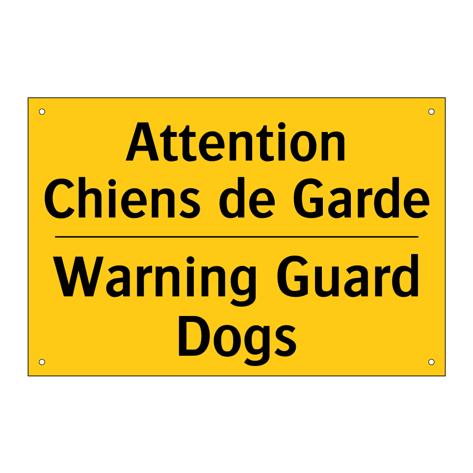 Panneau d'avertissement bilingue avec texte en français : "Attention Chiens de Garde", et en anglais : "Warning Guard Dogs"