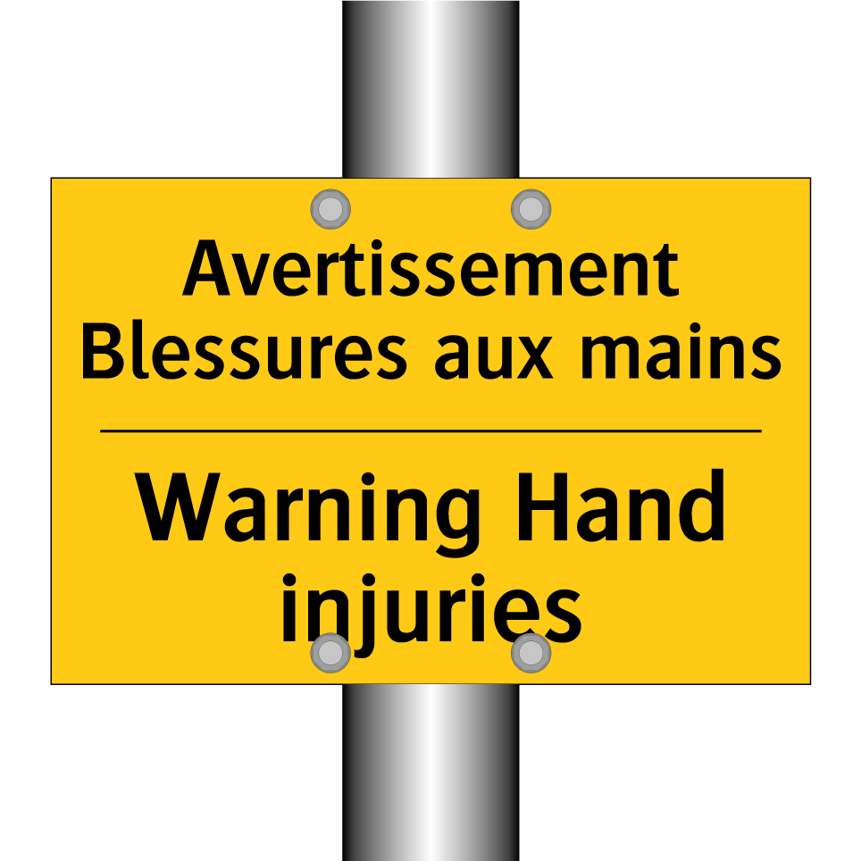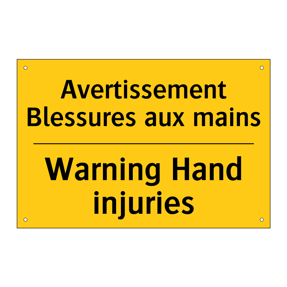 Panneau d'avertissement bilingue avec texte en français : "Avertissement Blessures aux mains", et en anglais : "Warning Hand injuries"