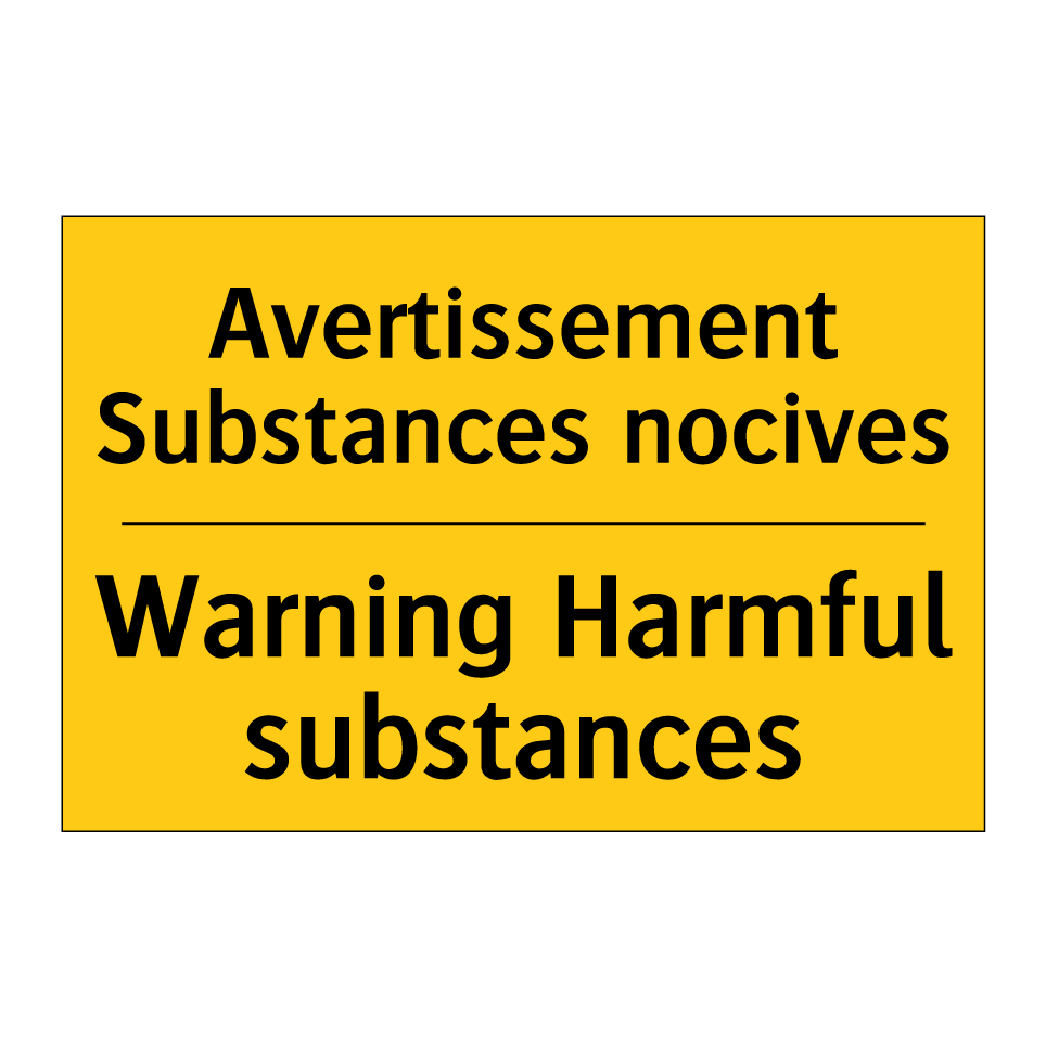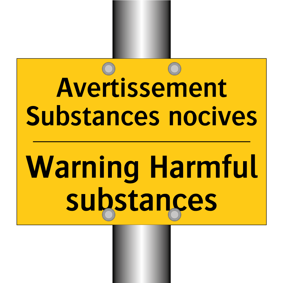 Panneau d'avertissement bilingue avec texte en français : "Avertissement Substances nocives", et en anglais : "Warning Harmful substances"
