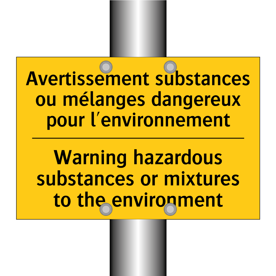 Panneau d'avertissement bilingue avec texte en français : "Avertissement substances ou mélanges dangereux pour l'environnement", et en anglais : "Warning hazardous substances or mixtures to the environment"