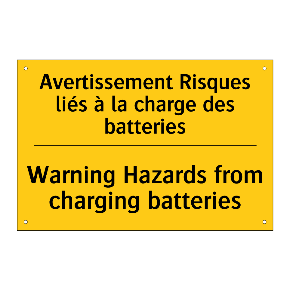 Panneau d'avertissement bilingue avec texte en français : "Avertissement Risques liés à la charge des batteries", et en anglais : "Warning Hazards from charging batteries"