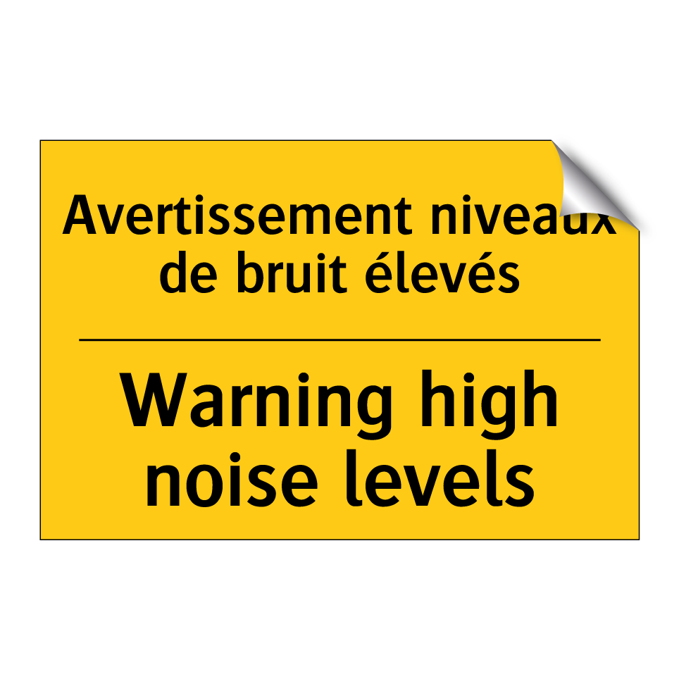 Panneau d'avertissement bilingue avec texte en français : "Avertissement niveaux de bruit élevés", et en anglais : "Warning high noise levels"