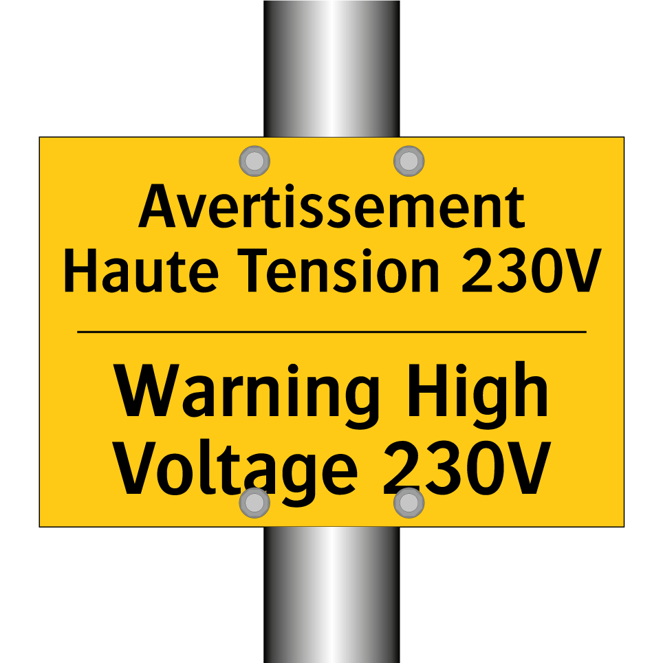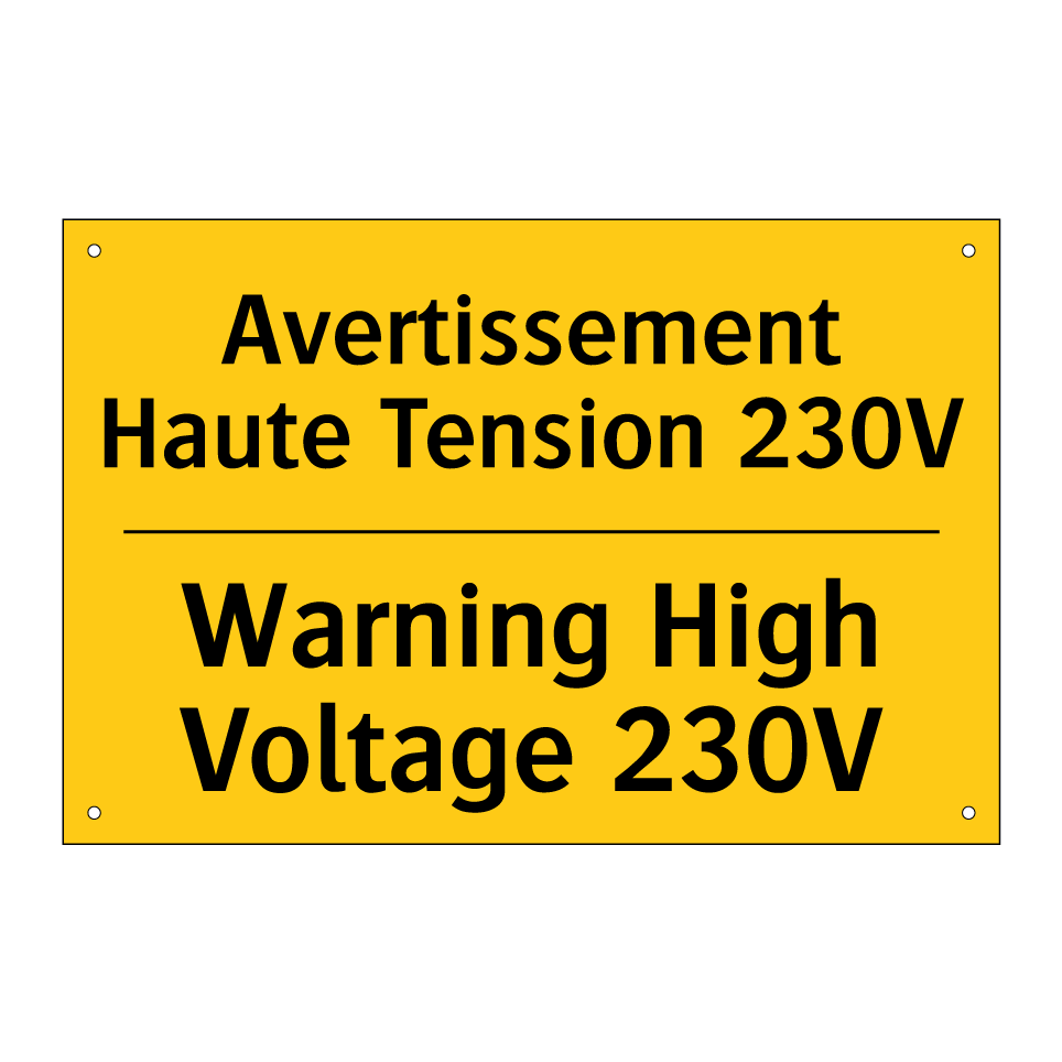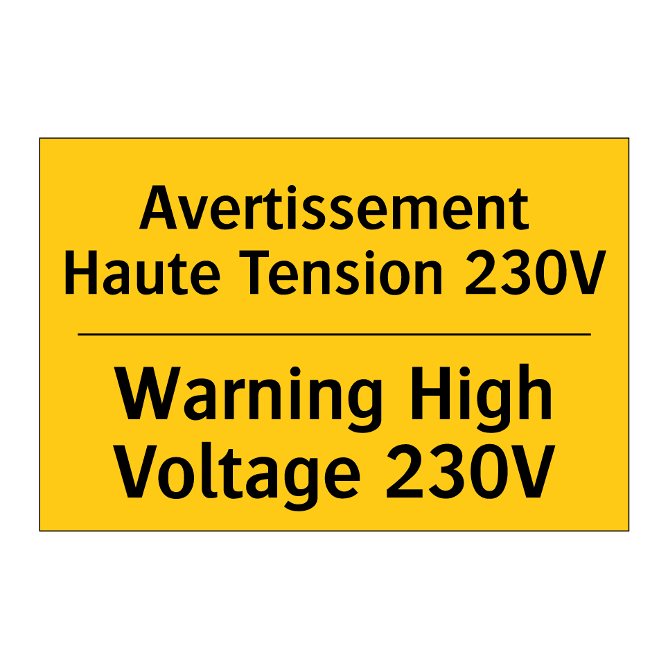 Panneau d'avertissement bilingue avec texte en français : "Avertissement Haute Tension 230V", et en anglais : "Warning High Voltage 230V"