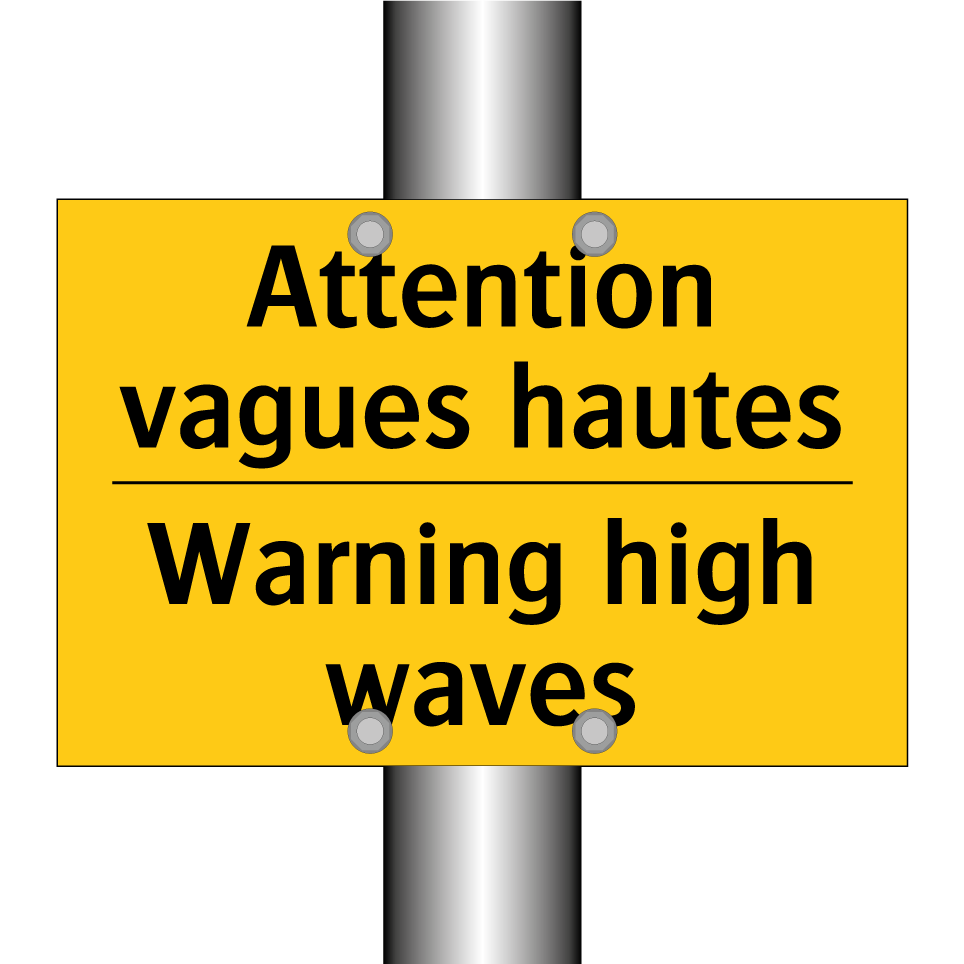 Panneau d'avertissement bilingue avec texte en français : "Attention vagues hautes", et en anglais : "Warning high waves"