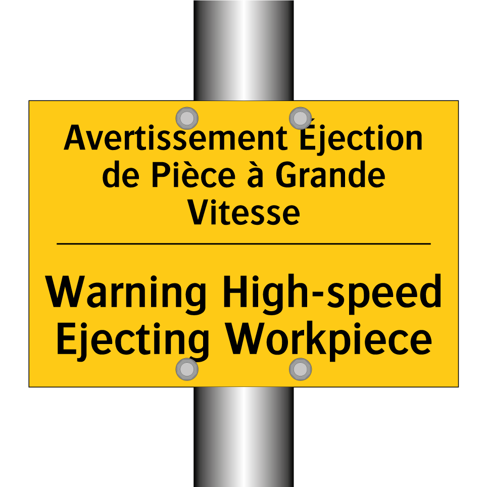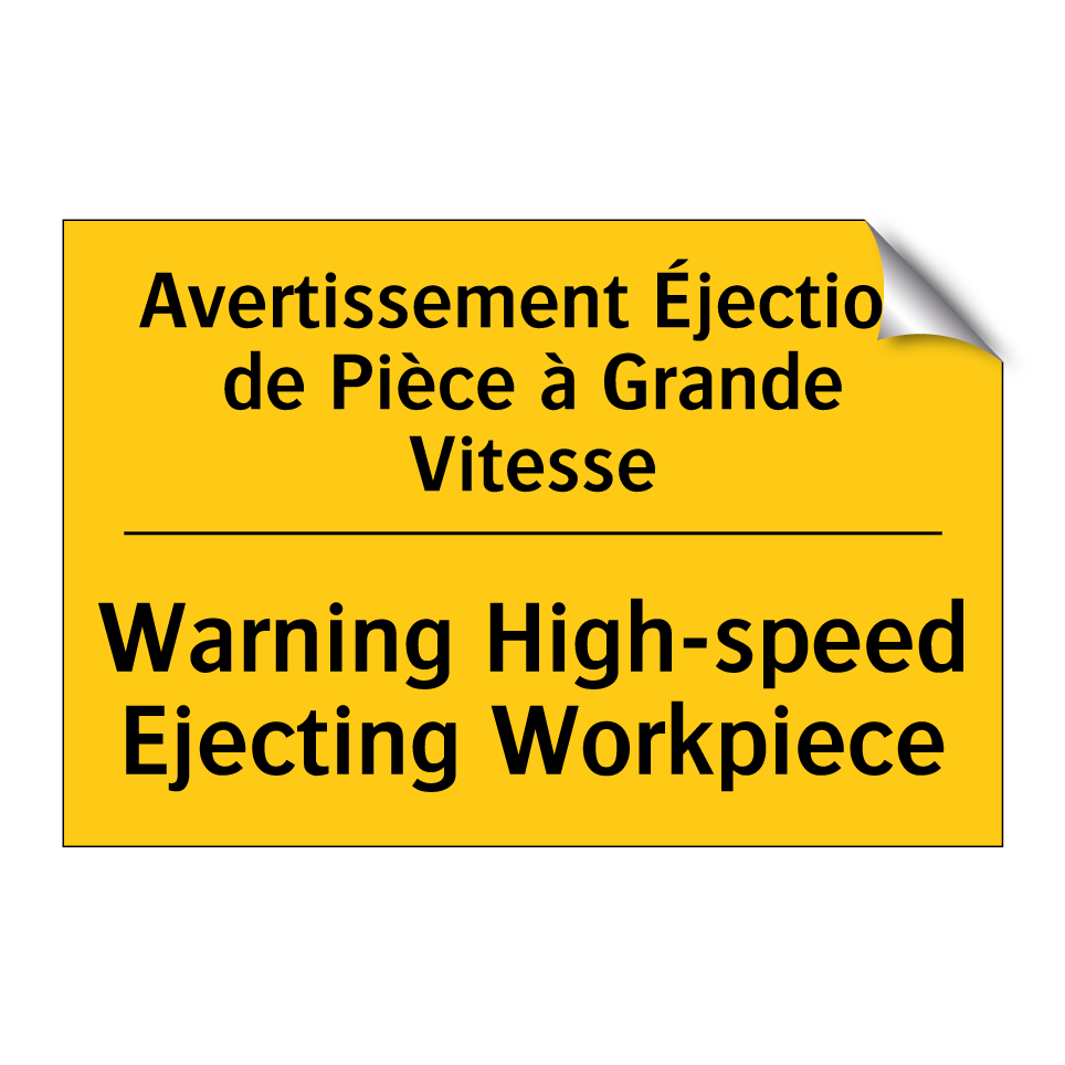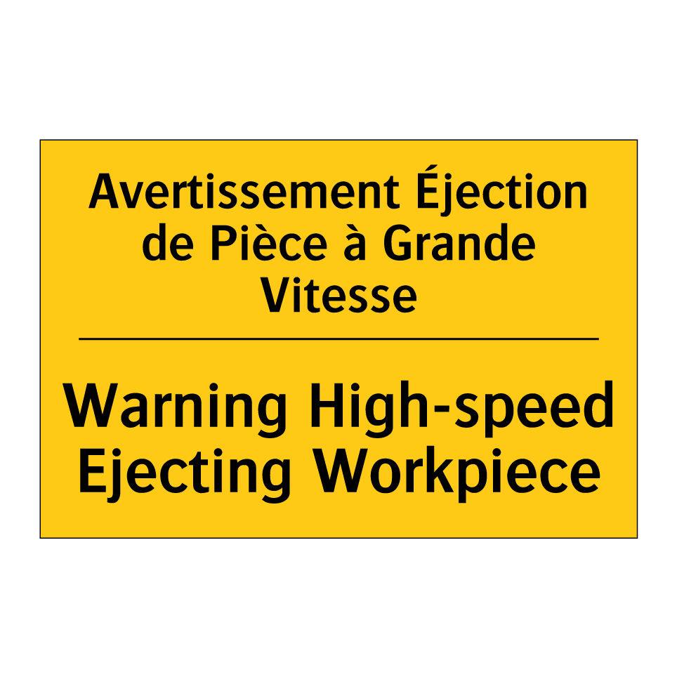 Panneau d'avertissement bilingue avec texte en français : "Avertissement Éjection de Pièce à Grande Vitesse", et en anglais : "Warning High-speed Ejecting Workpiece"