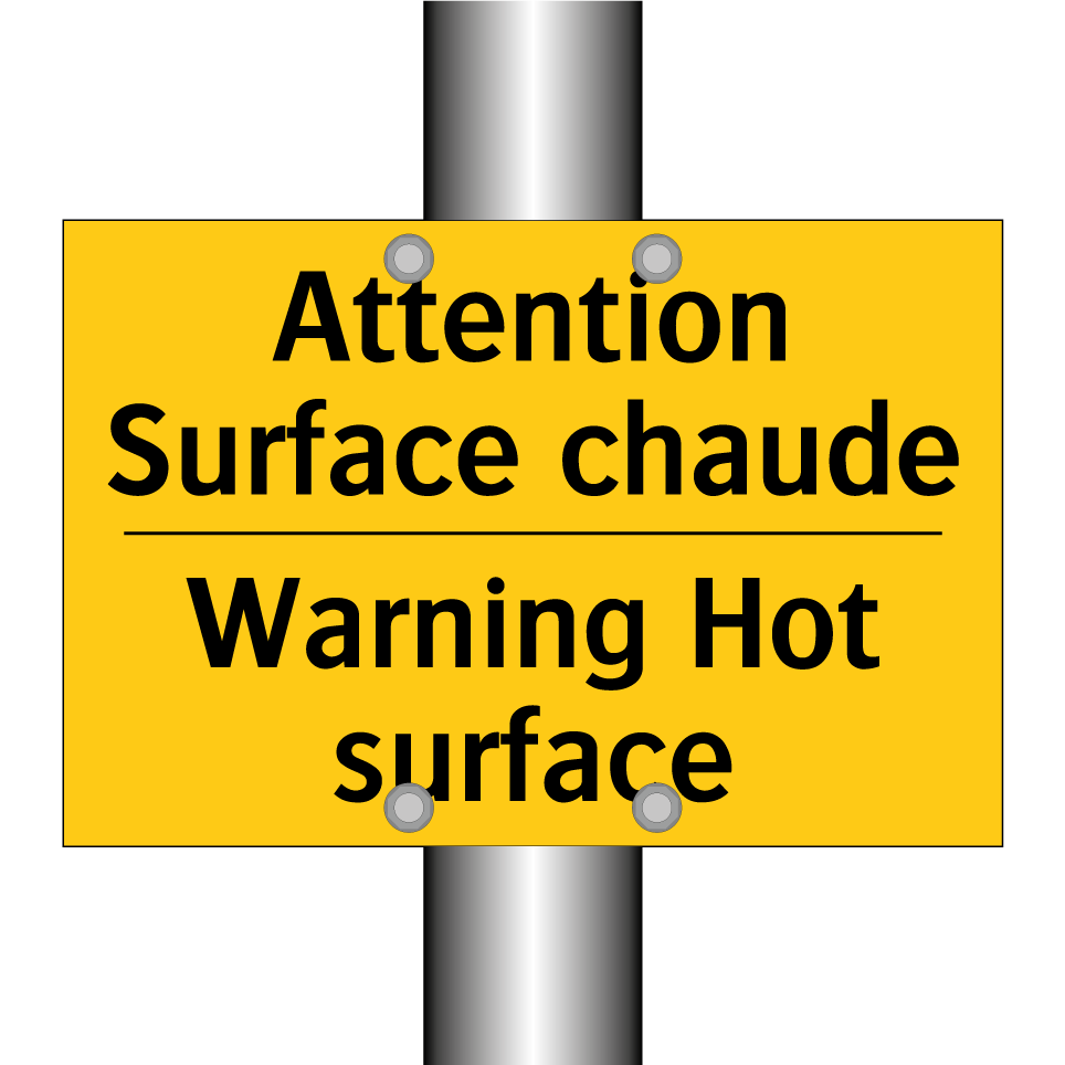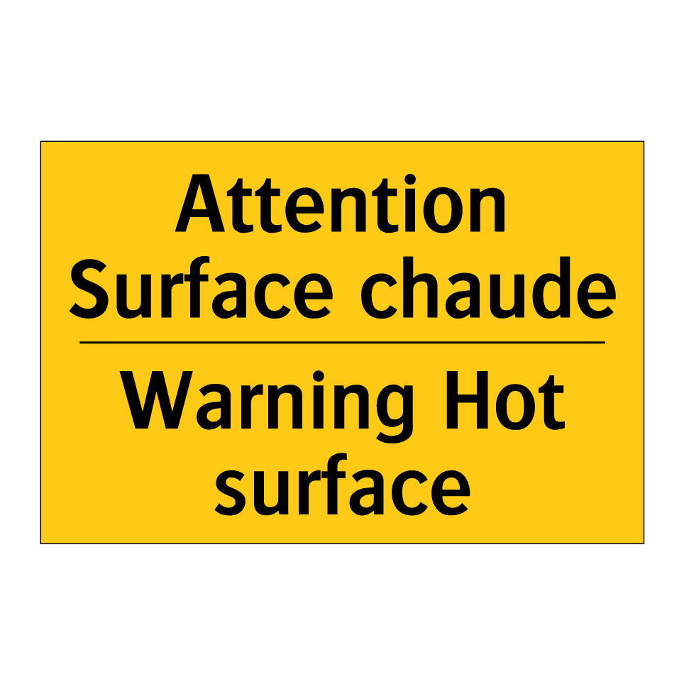 Panneau d'avertissement bilingue avec texte en français : "Attention Surface chaude", et en anglais : "Warning Hot surface"