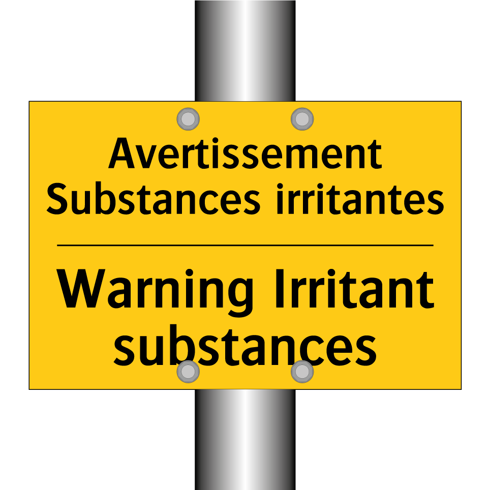 Panneau d'avertissement bilingue avec texte en français : "Avertissement Substances irritantes", et en anglais : "Warning Irritant substances"