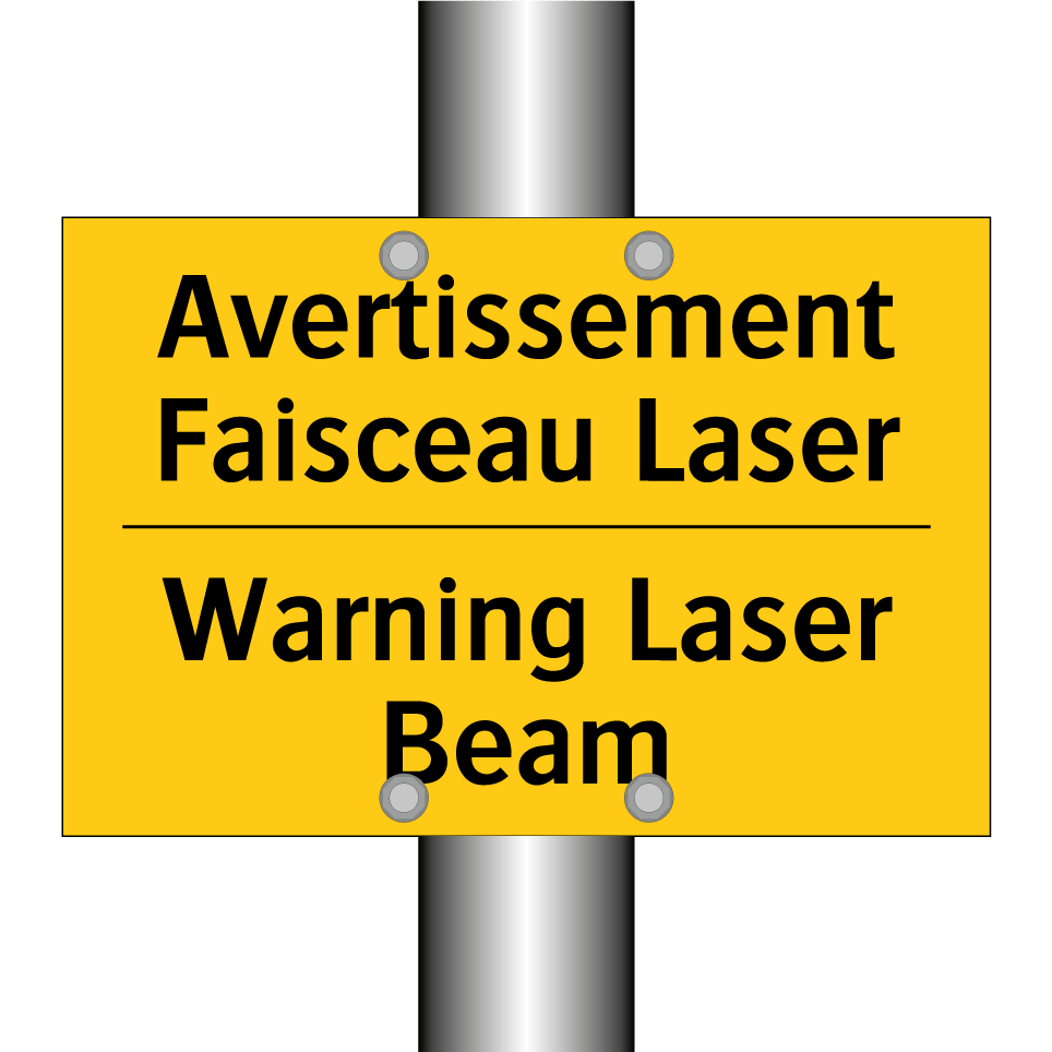 Panneau d'avertissement bilingue avec texte en français : "Avertissement Faisceau Laser", et en anglais : "Warning Laser Beam"