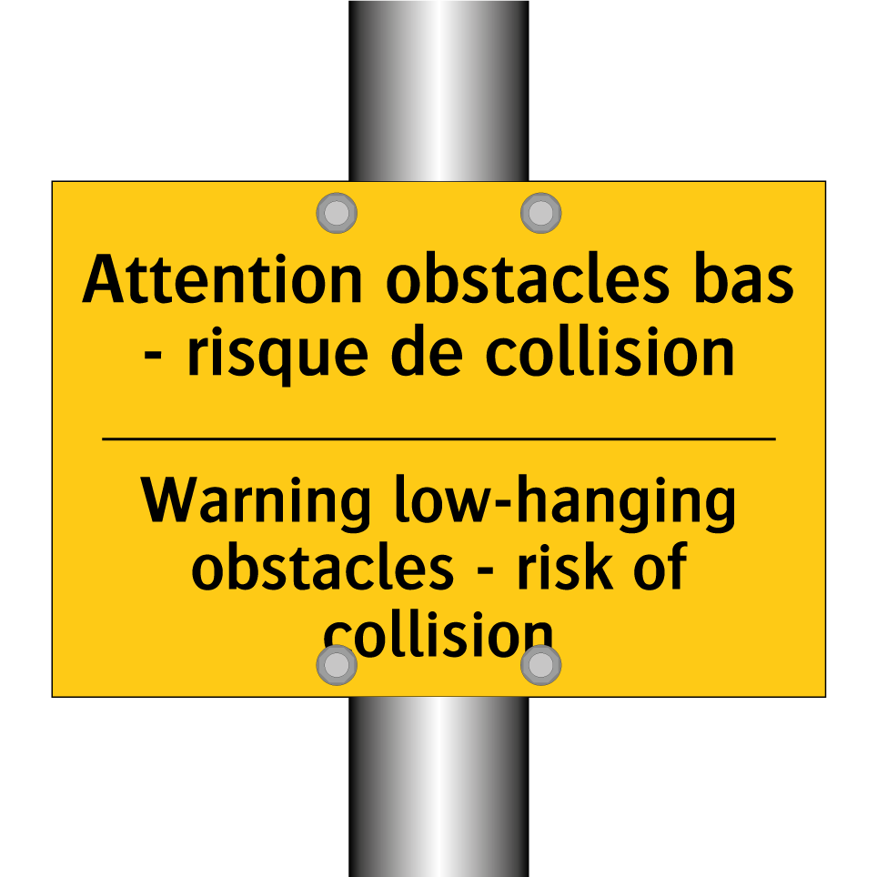 Panneau d'avertissement bilingue avec texte en français : "Attention obstacles bas - risque de collision", et en anglais : "Warning low-hanging obstacles - risk of collision"