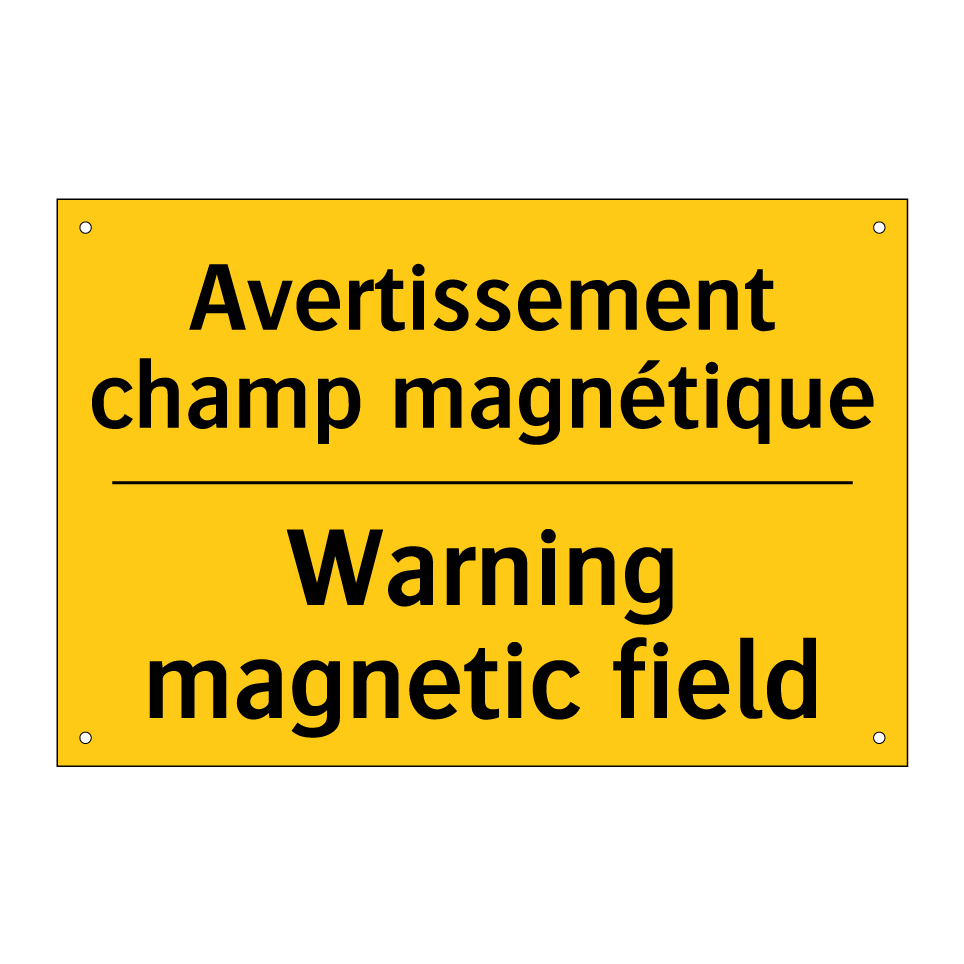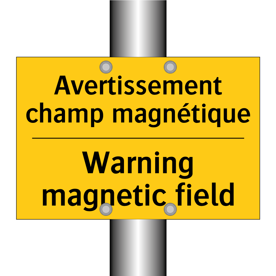 Panneau d'avertissement bilingue avec texte en français : "Avertissement champ magnétique", et en anglais : "Warning magnetic field"
