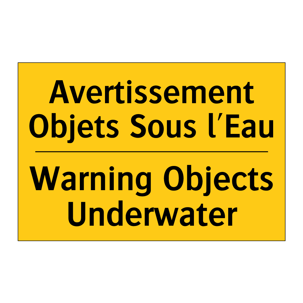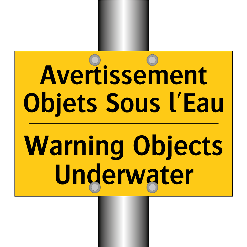 Panneau d'avertissement bilingue avec texte en français : "Avertissement Objets Sous l'Eau", et en anglais : "Warning Objects Underwater"