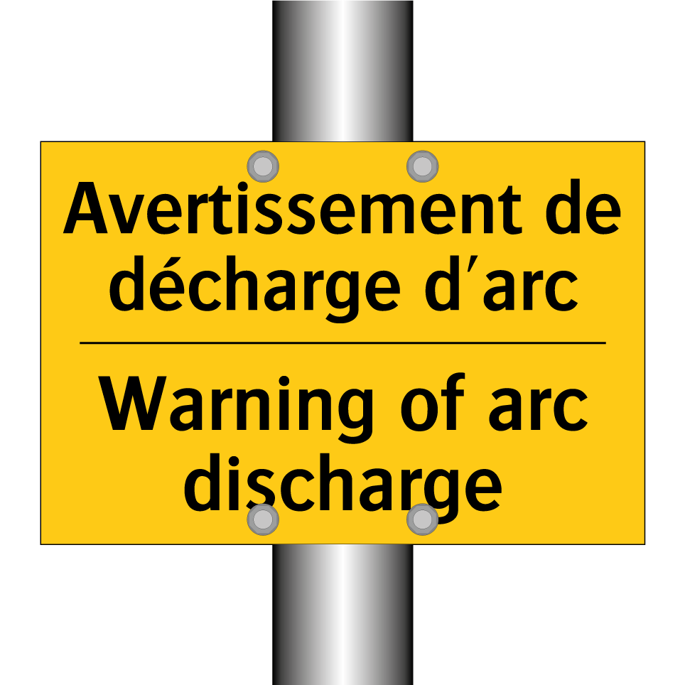 Panneau d'avertissement bilingue avec texte en français : "Avertissement de décharge d'arc", et en anglais : "Warning of arc discharge"