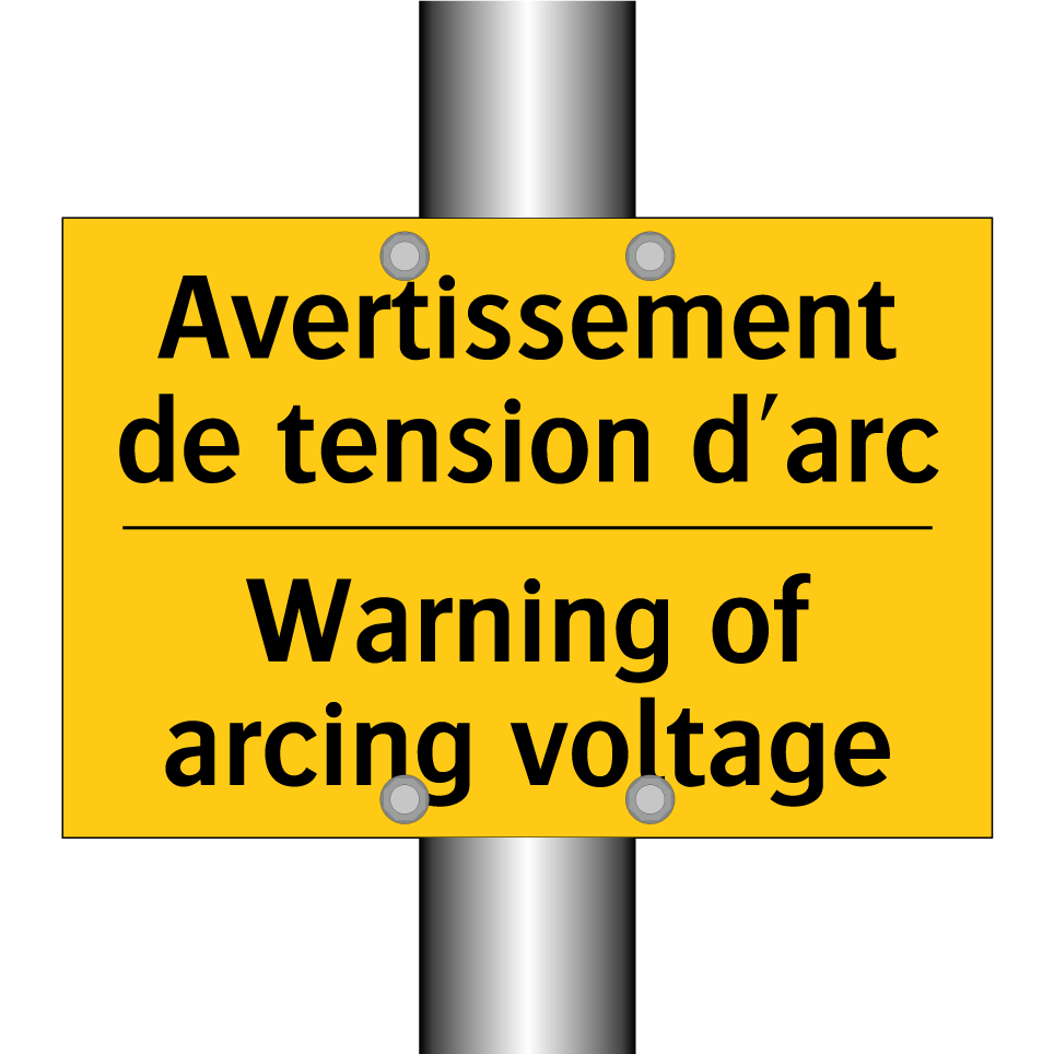 Panneau d'avertissement bilingue avec texte en français : "Avertissement de tension d'arc", et en anglais : "Warning of arcing voltage"