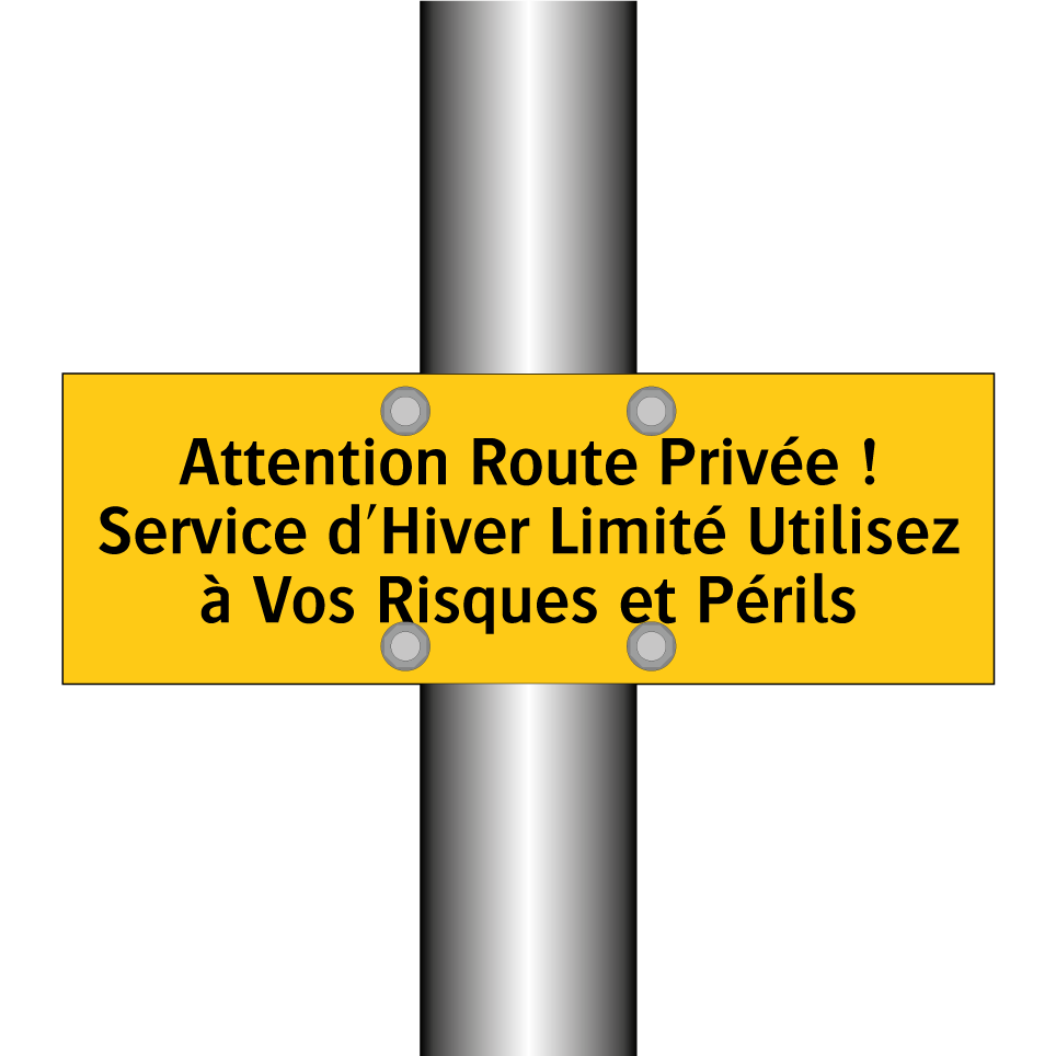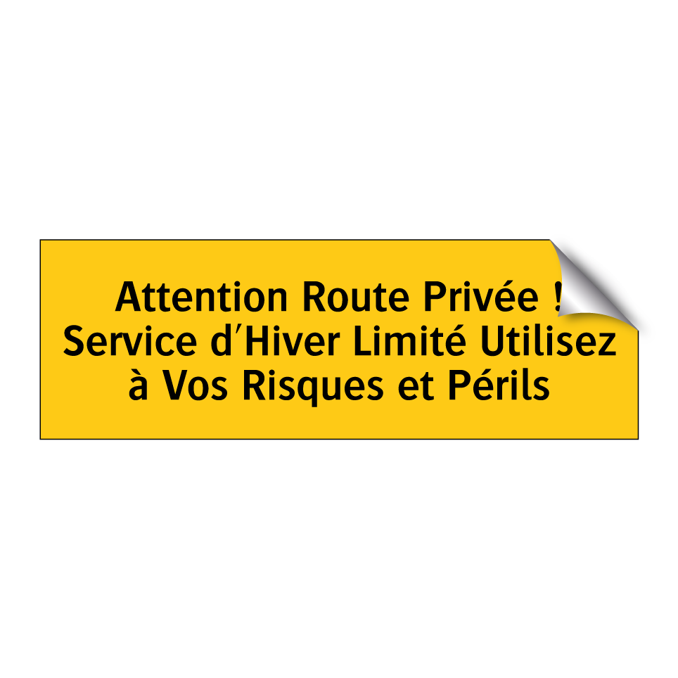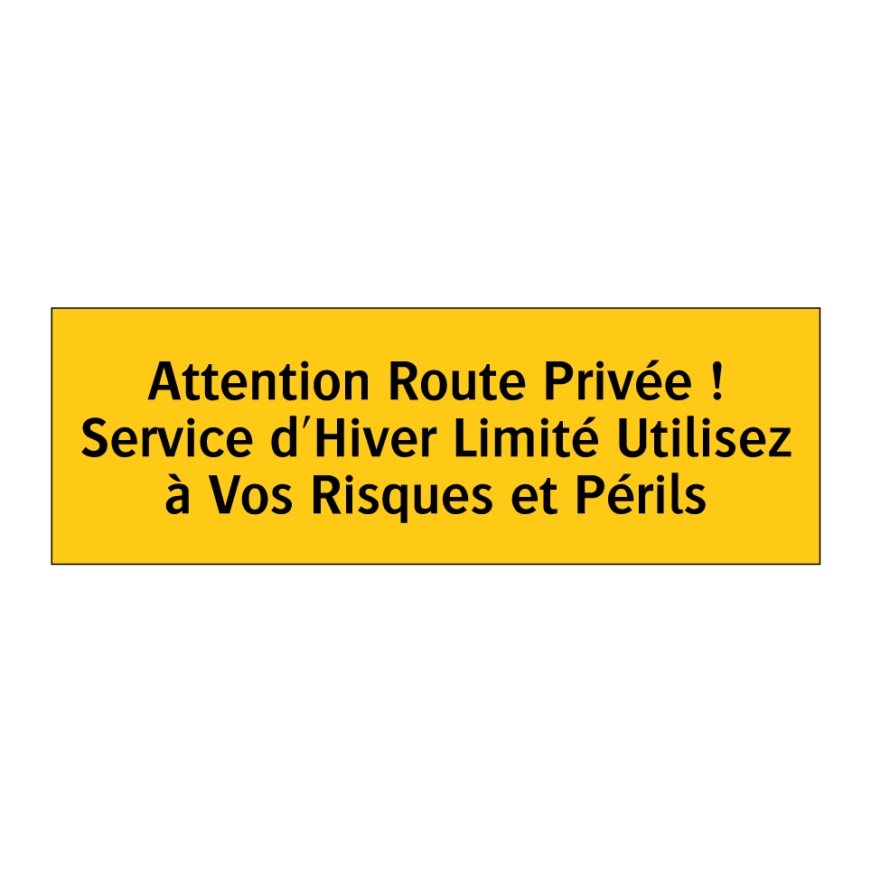 Panneau d'avertissement avec le texte : "Attention Route Privée ! Service d'Hiver Limité Utilisez à Vos Risques et Périls"