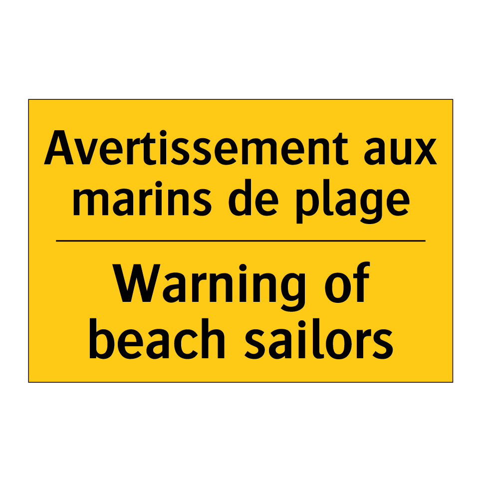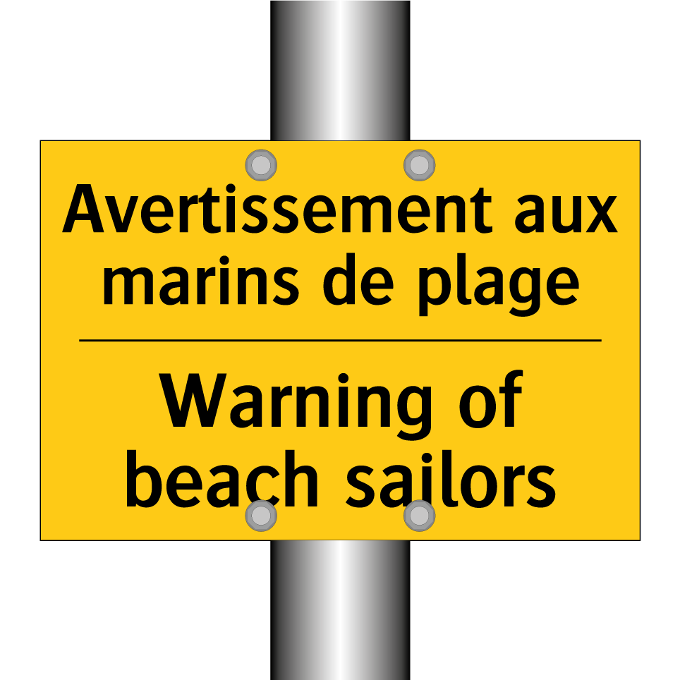 Panneau d'avertissement bilingue avec texte en français : "Avertissement aux marins de plage", et en anglais : "Warning of beach sailors"