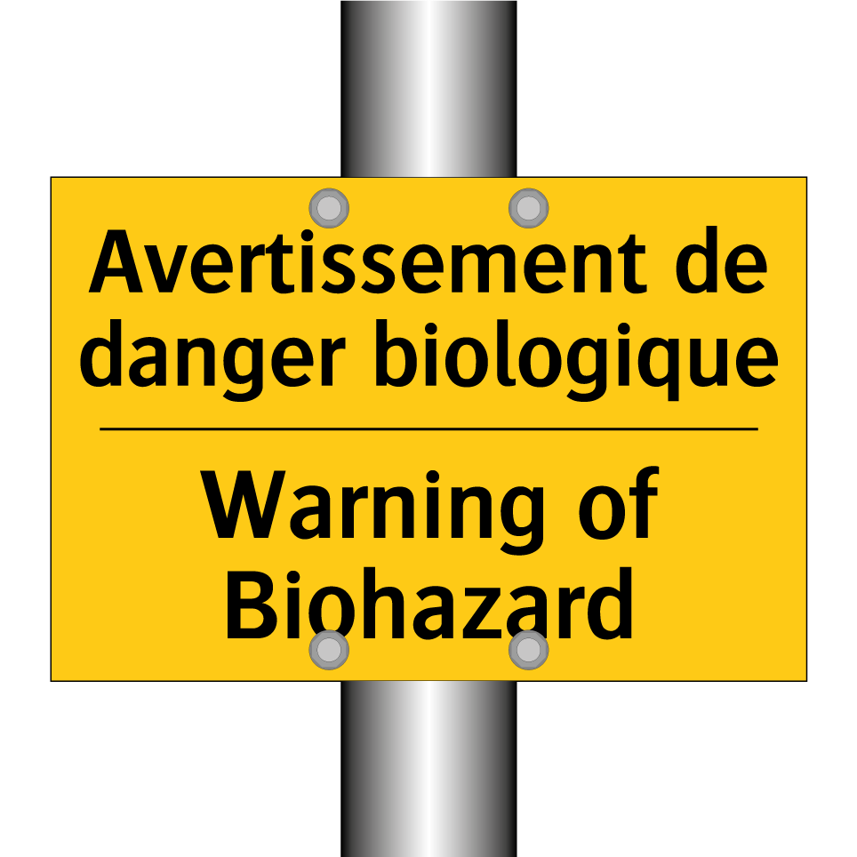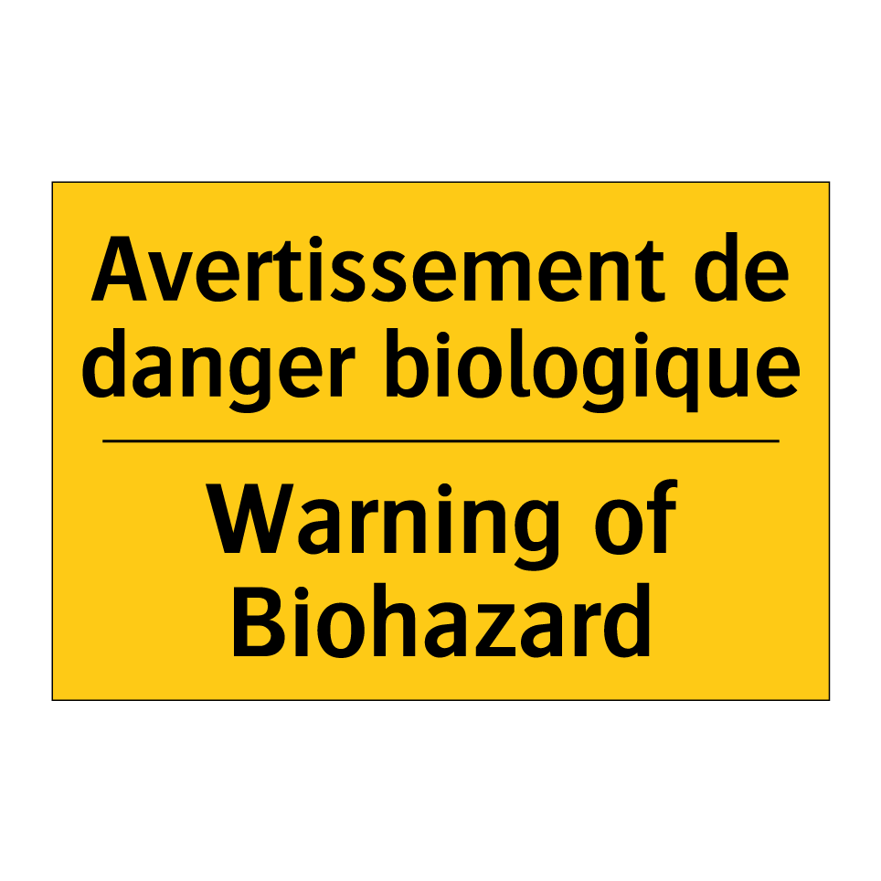 Panneau d'avertissement bilingue avec texte en français : "Avertissement de danger biologique", et en anglais : "Warning of Biohazard"