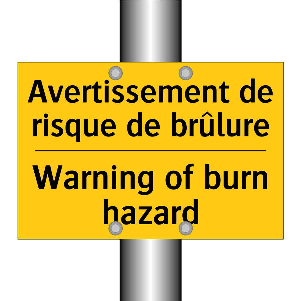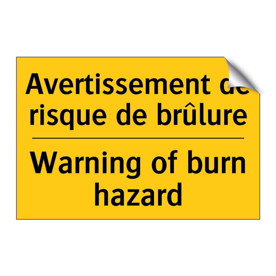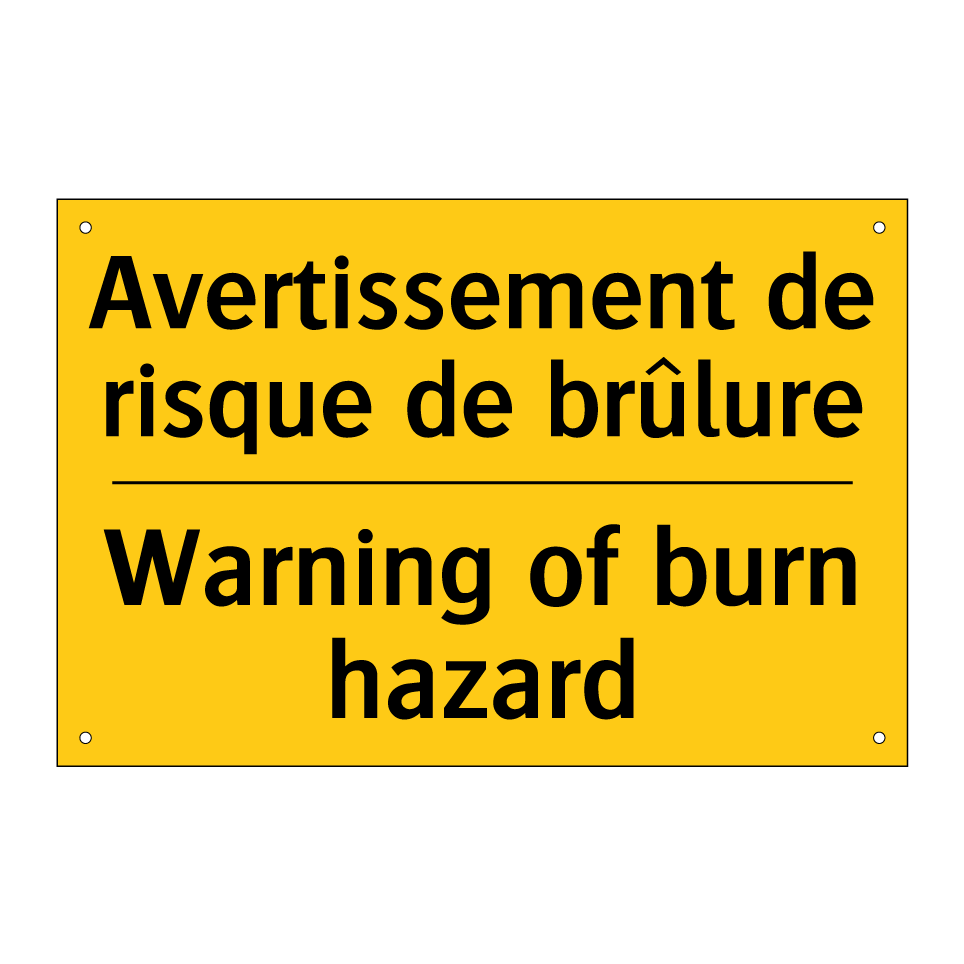 Panneau d'avertissement bilingue avec texte en français : "Avertissement de risque de brûlure", et en anglais : "Warning of burn hazard"