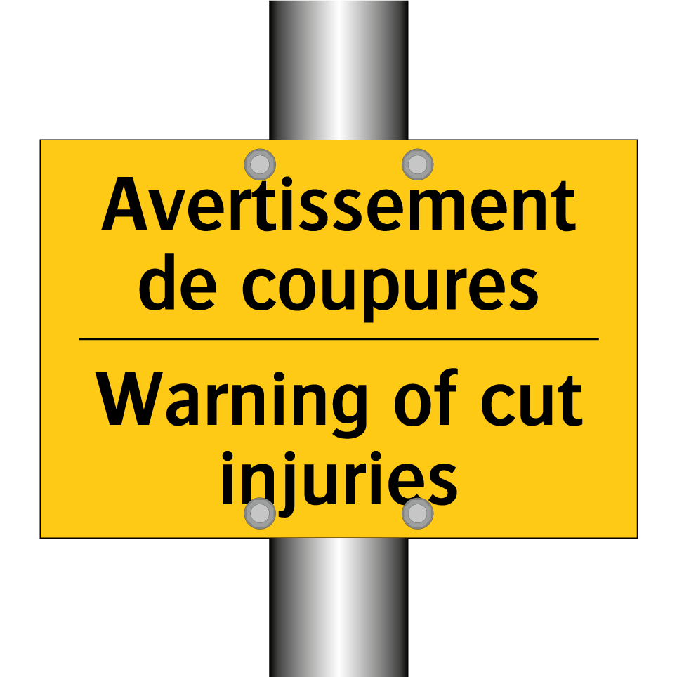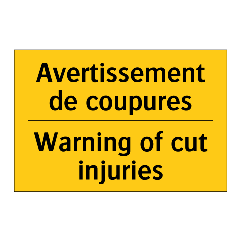 Panneau d'avertissement bilingue avec texte en français : "Avertissement de coupures", et en anglais : "Warning of cut injuries"