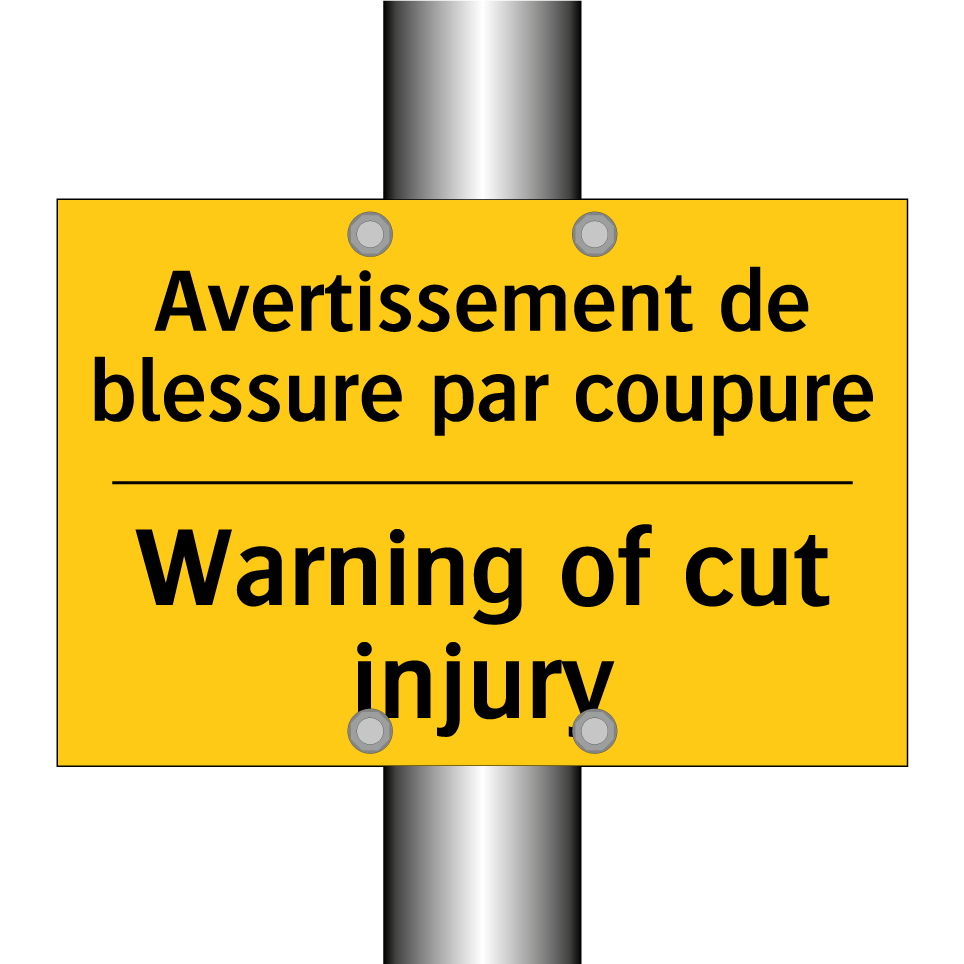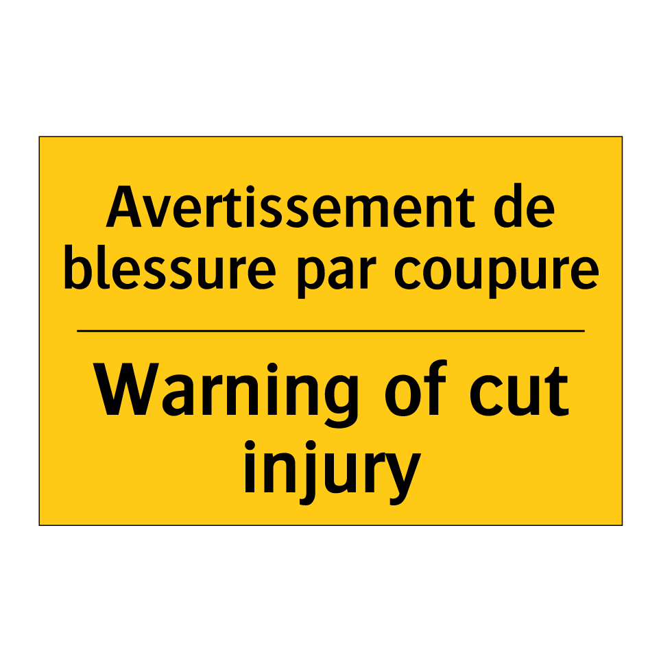 Panneau d'avertissement bilingue avec texte en français : "Avertissement de blessure par coupure", et en anglais : "Warning of cut injury"