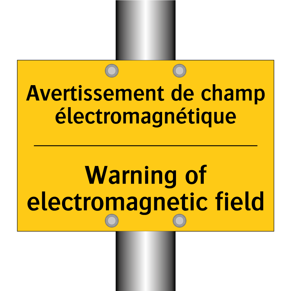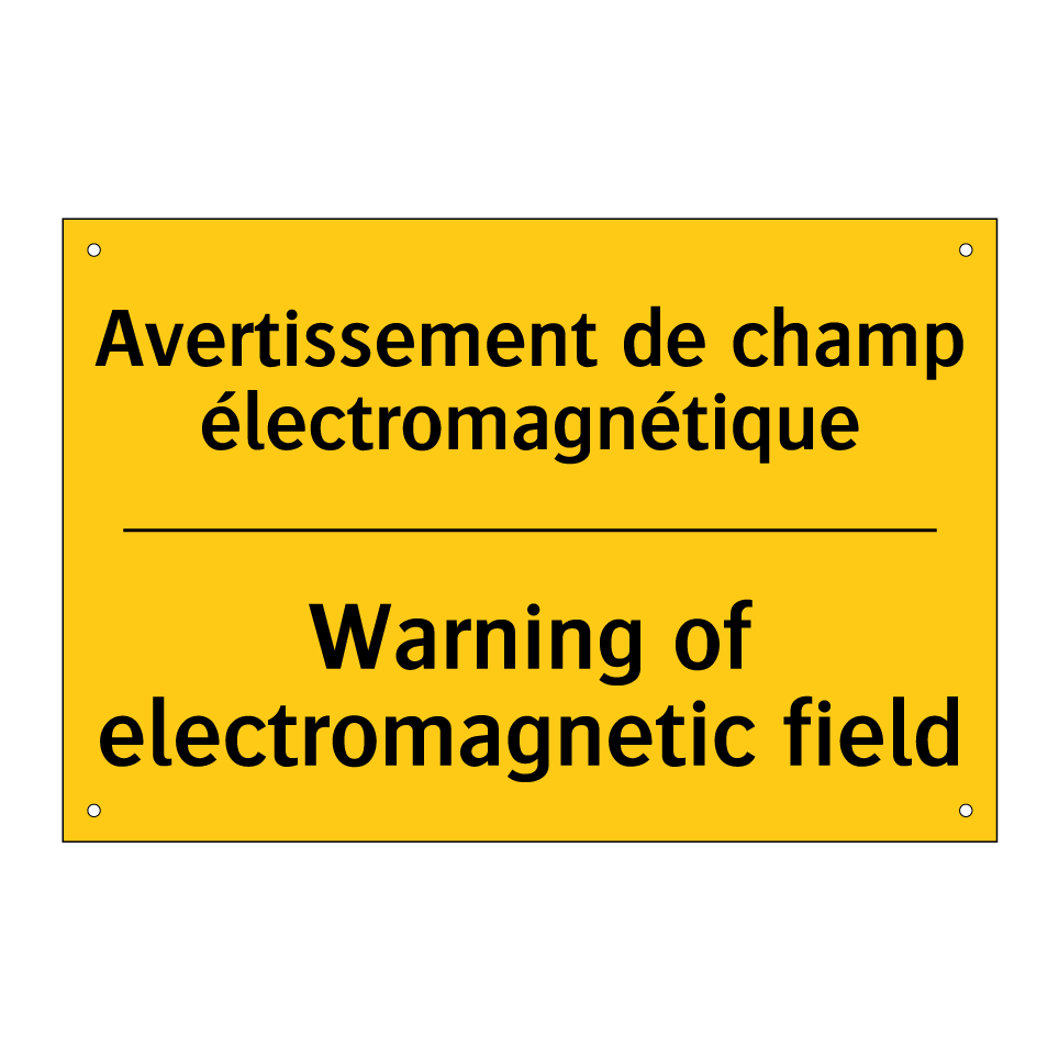 Panneau d'avertissement bilingue avec texte en français : "Avertissement de champ électromagnétique", et en anglais : "Warning of electromagnetic field"