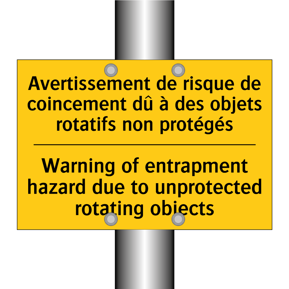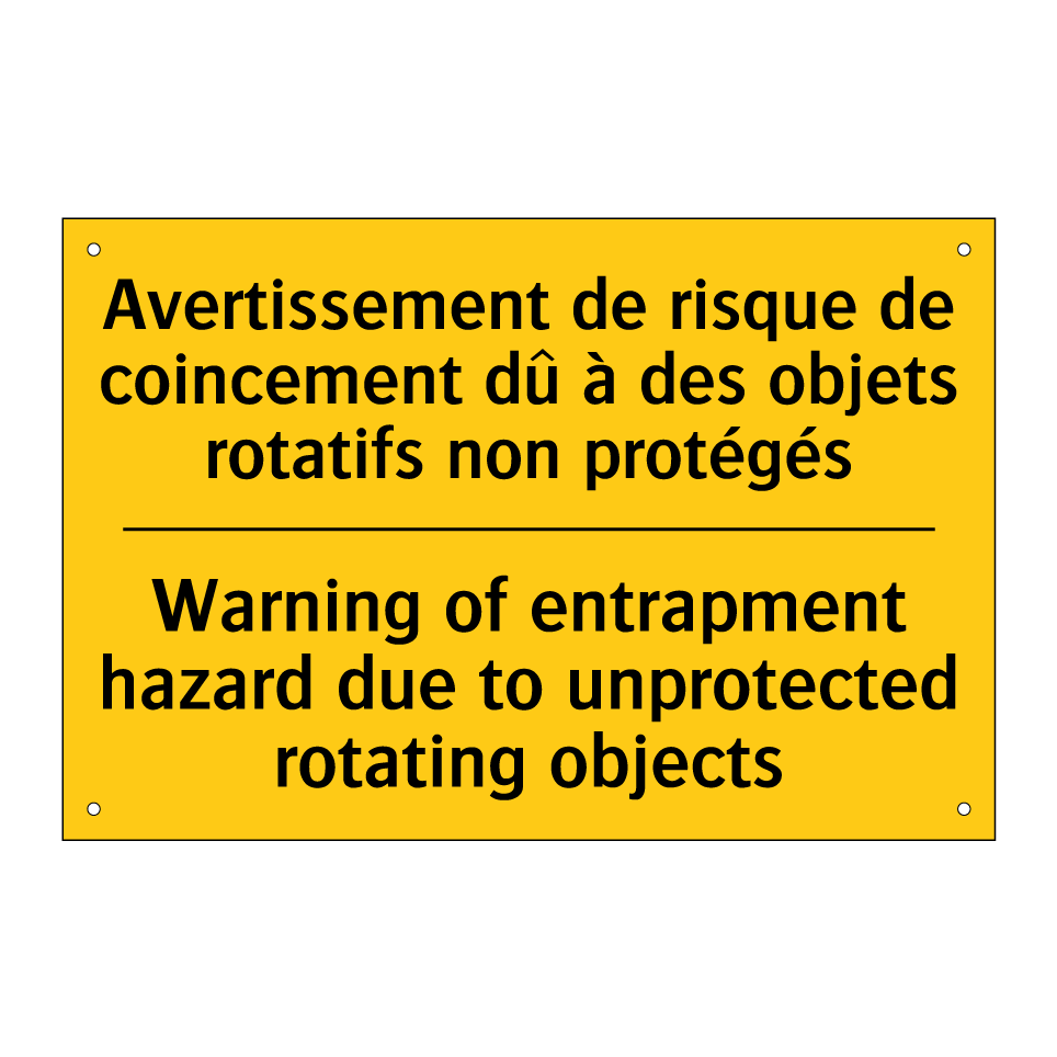 Panneau d'avertissement bilingue avec texte en français : "Avertissement de risque de coincement dû à des objets rotatifs non protégés", et en anglais : "Warning of entrapment hazard due to unprotected rotating objects"
