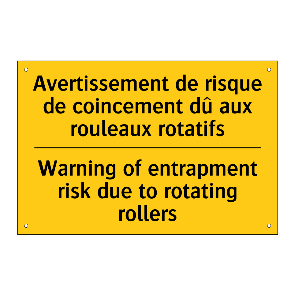 Panneau d'avertissement bilingue avec texte en français : "Avertissement de risque de coincement dû aux rouleaux rotatifs", et en anglais : "Warning of entrapment risk due to rotating rollers"