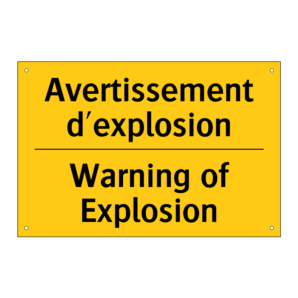 Panneau d'avertissement bilingue avec texte en français : "Avertissement d'explosion", et en anglais : "Warning of Explosion"