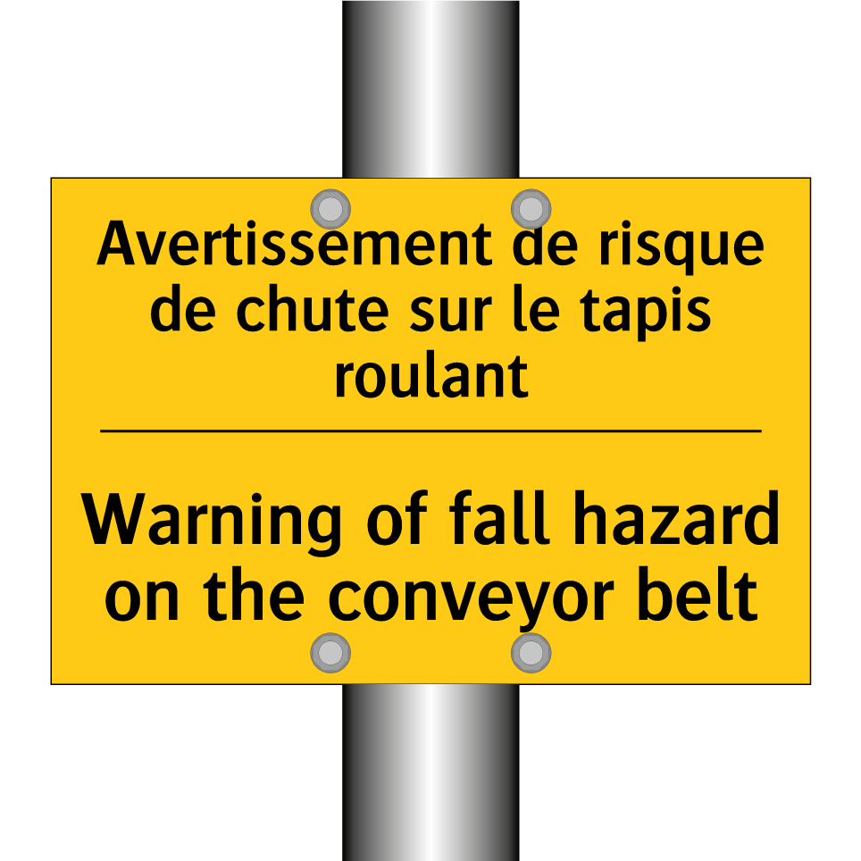 Panneau d'avertissement bilingue avec texte en français : "Avertissement de risque de chute sur le tapis roulant", et en anglais : "Warning of fall hazard on the conveyor belt"