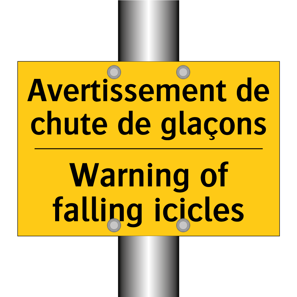 Panneau d'avertissement bilingue avec texte en français : "Avertissement de chute de glaçons", et en anglais : "Warning of falling icicles"