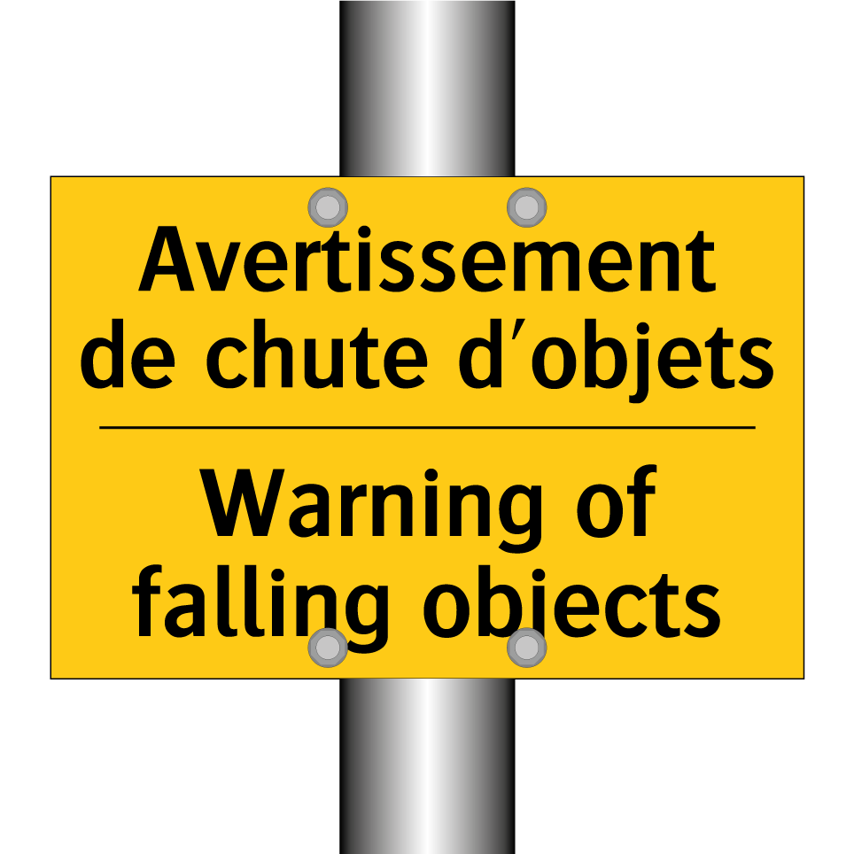 Panneau d'avertissement bilingue avec texte en français : "Avertissement de chute d'objets", et en anglais : "Warning of falling objects"