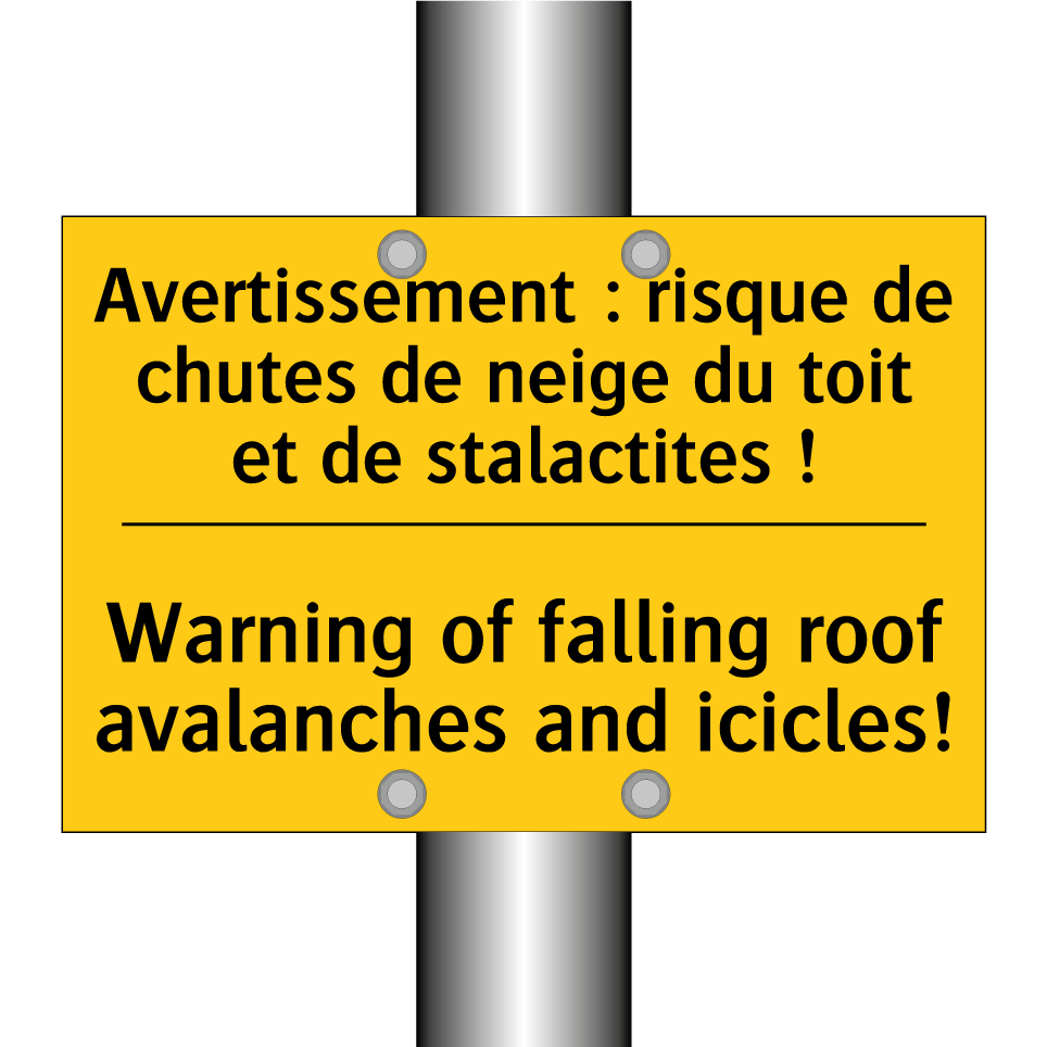Panneau d'avertissement bilingue avec texte en français : "Avertissement : risque de chutes de neige du toit et de stalactites !", et en anglais : "Warning of falling roof avalanches and icicles!"