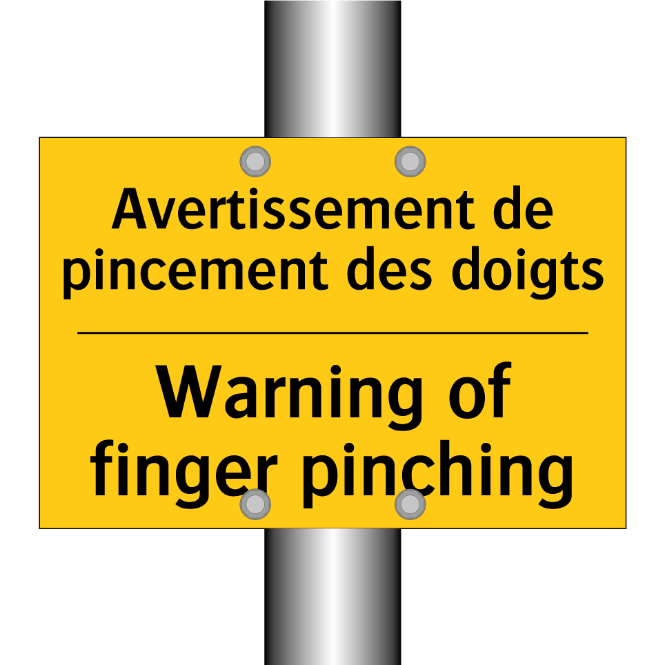 Panneau d'avertissement bilingue avec texte en français : "Avertissement de pincement des doigts", et en anglais : "Warning of finger pinching"