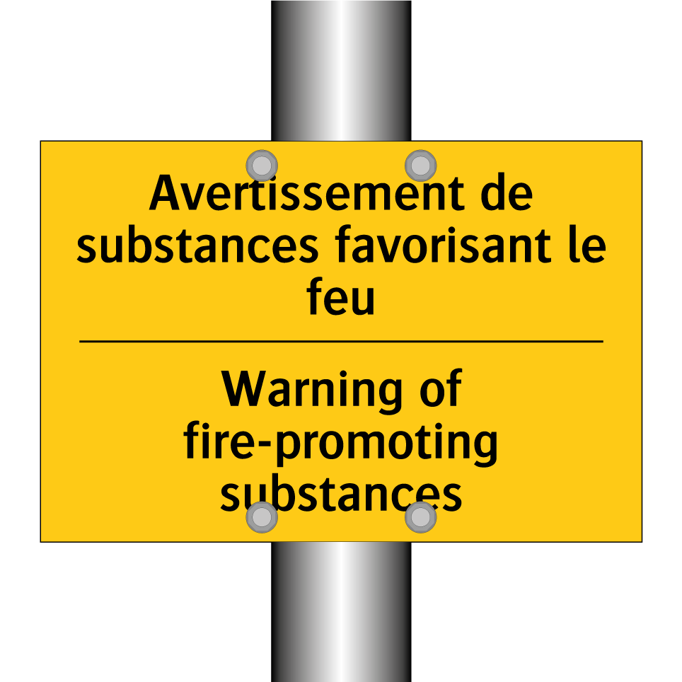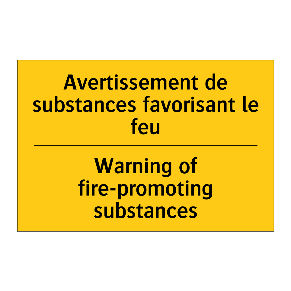Panneau d'avertissement bilingue avec texte en français : "Avertissement de substances favorisant le feu", et en anglais : "Warning of fire-promoting substances"